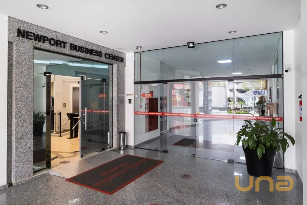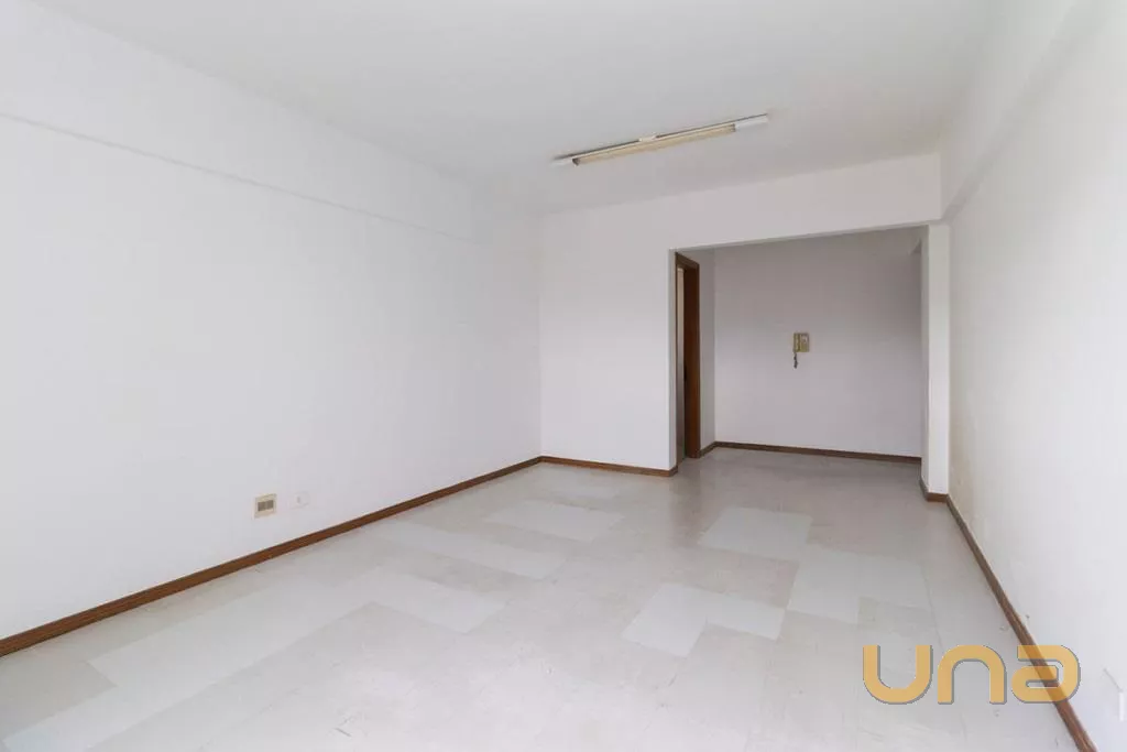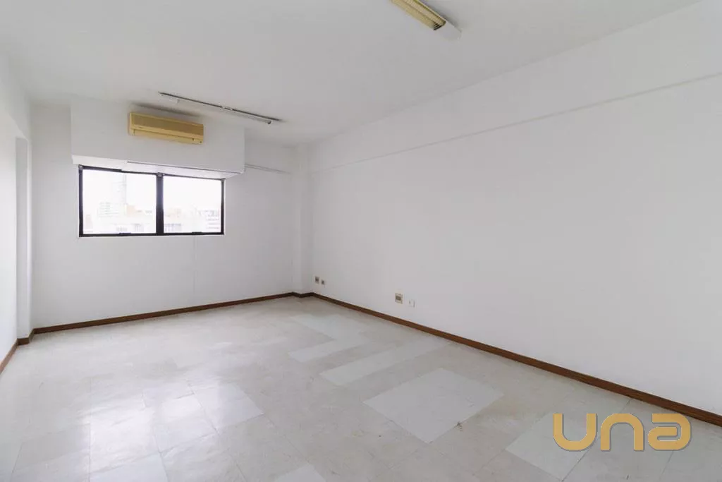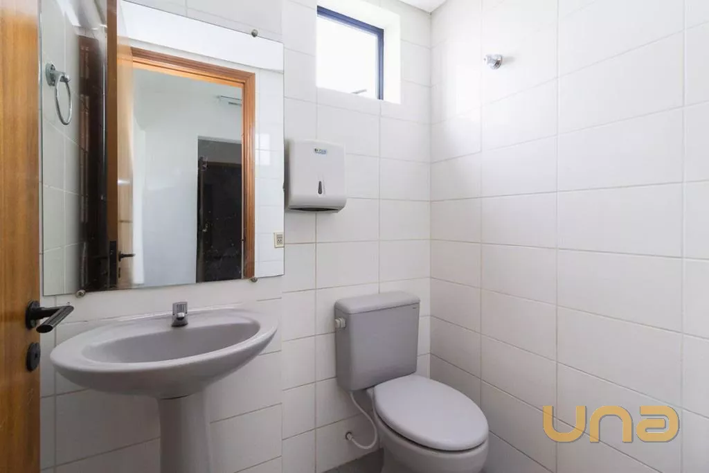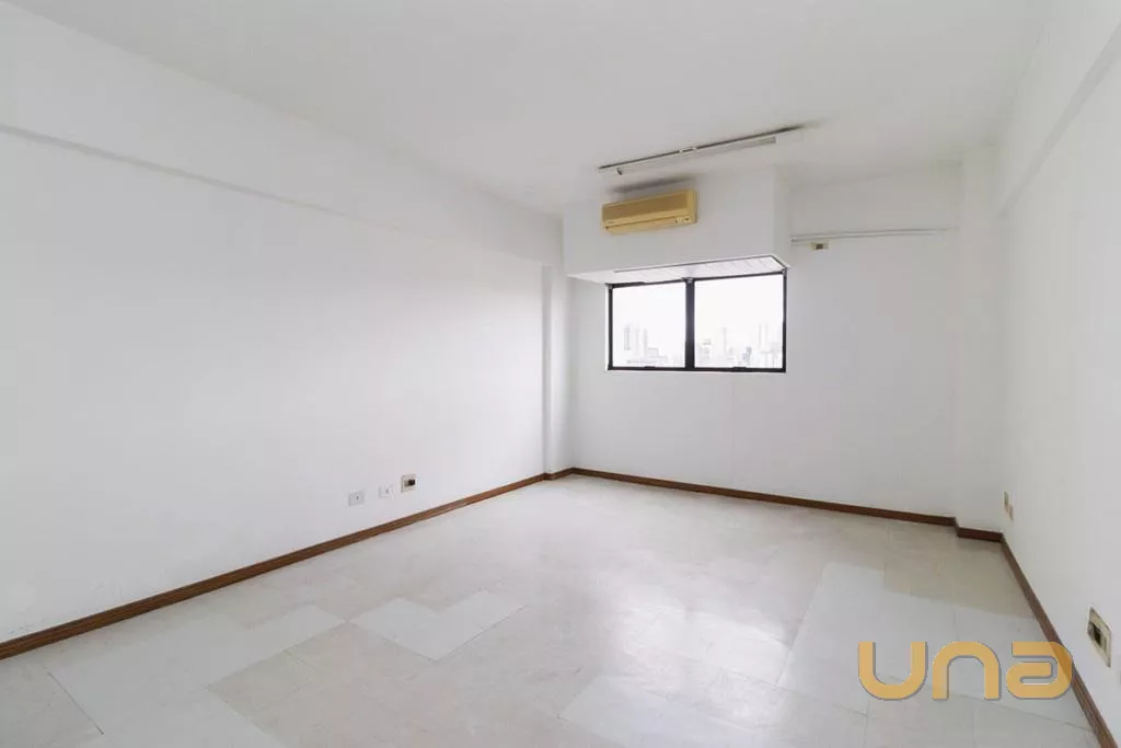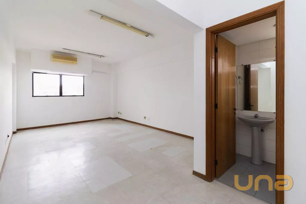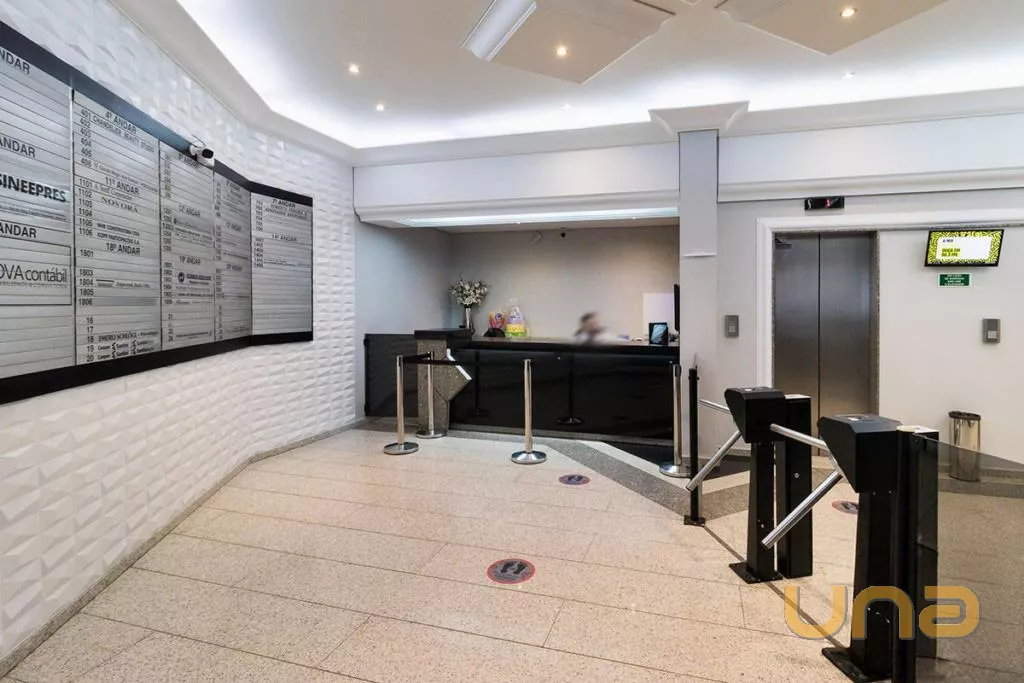 Descrição: Conjunto comercial em andar alto, vão livre, sem móveis, um banheiro com pia e espelho, piso emborrachado, uma vaga de garagem rotativa.