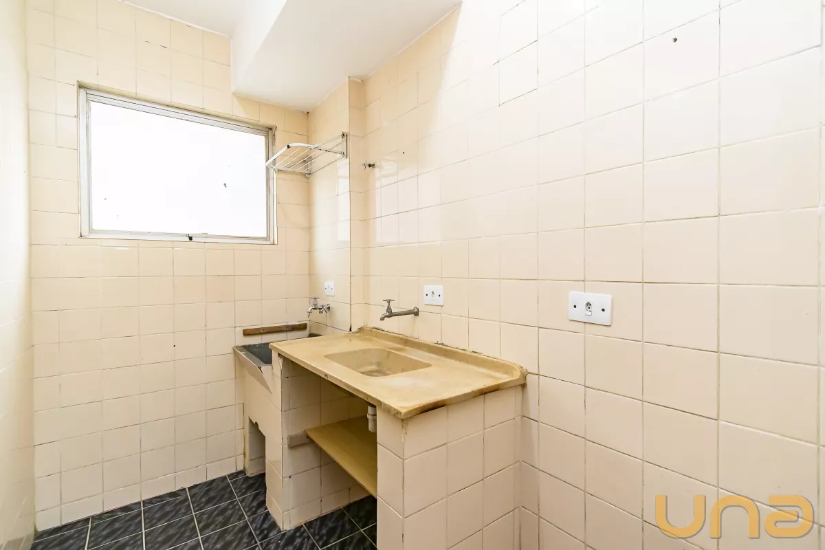 Apartamento com quarto amplo, sala de estar para 2 ambientes, banheiro e cozinha com pia, armário e área de serviço.