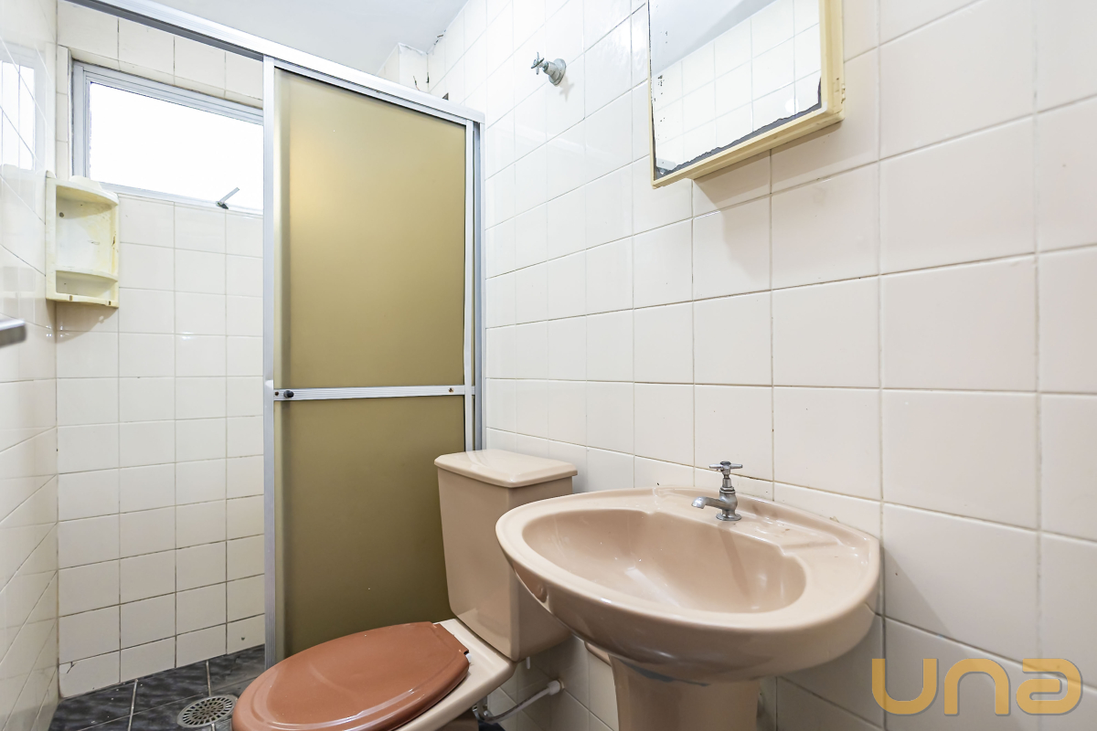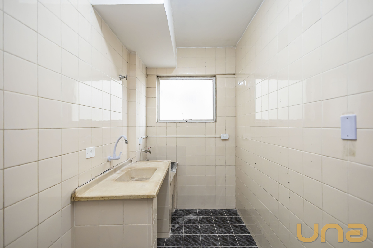 Detalhes: Apartamento com quarto amplo, sala de estar para 2 ambientes, banheiro e cozinha com pia, armário e área de serviço.
