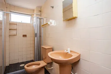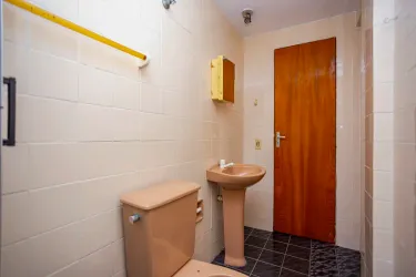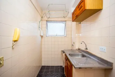 Apartamento com quarto amplo, sala de estar para 2 ambientes, banheiro e cozinha com pia, armário e área de serviço.