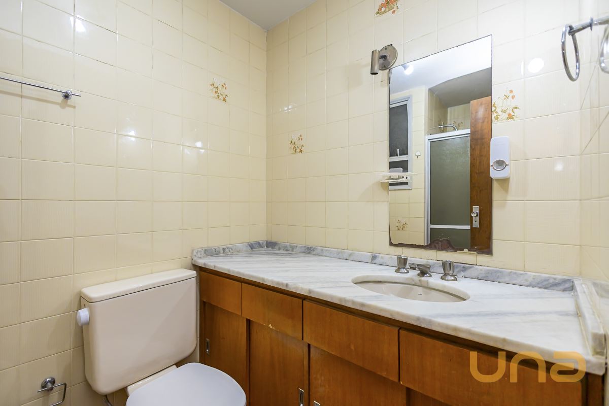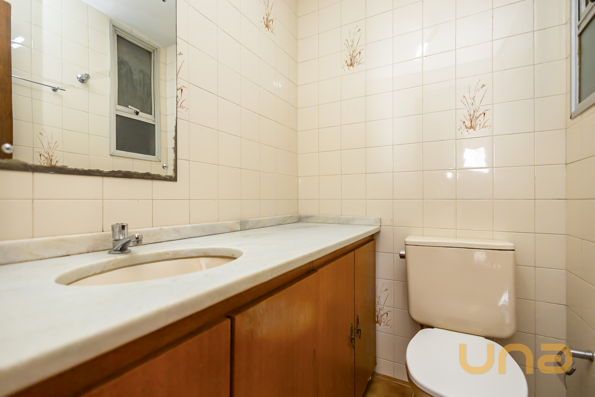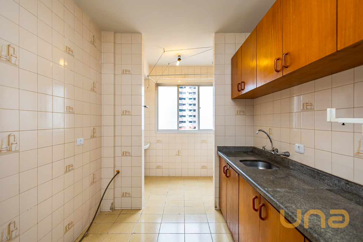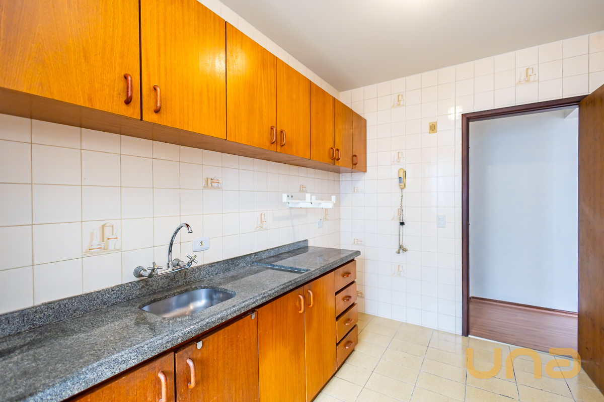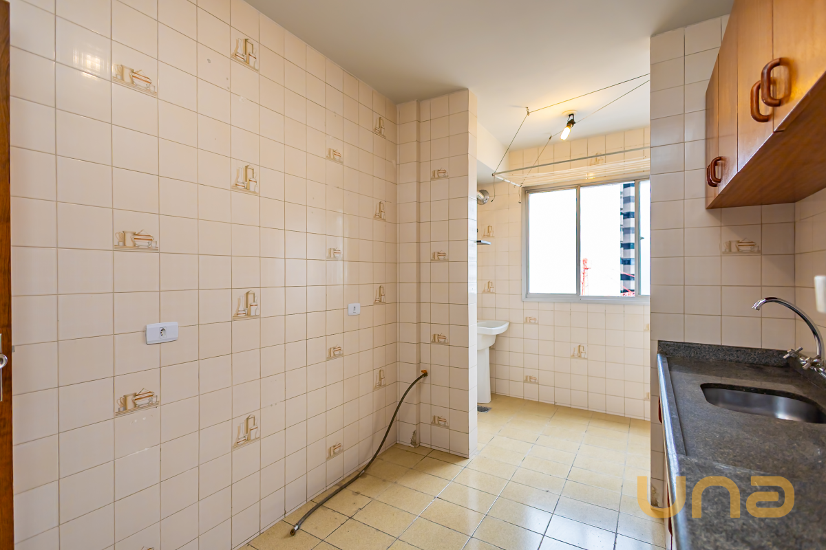 O apartamento possui três quartos, sendo dois com armários, além de banheiro social e lavabo com armários. A sala é ampla para dois ambientes, a cozinha conta com armários e a área de serviço é independente. O imóvel dispõe ainda de aquecimento a gás, piso laminado e vaga de garagem para carro pequeno. O condomínio oferece portaria 24 horas e salão de festas.