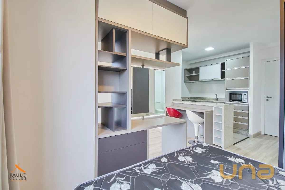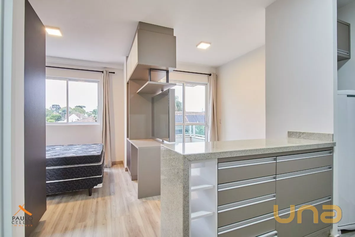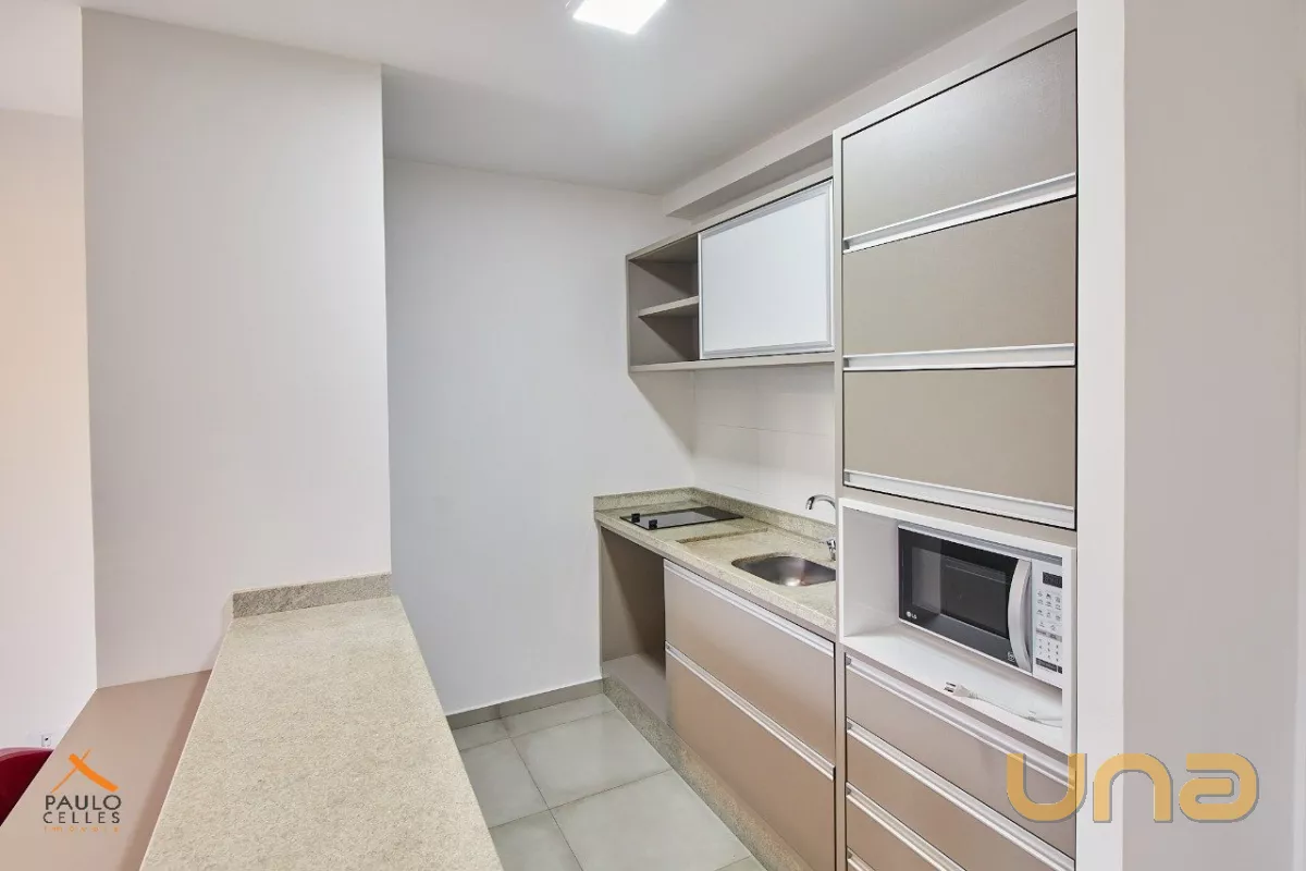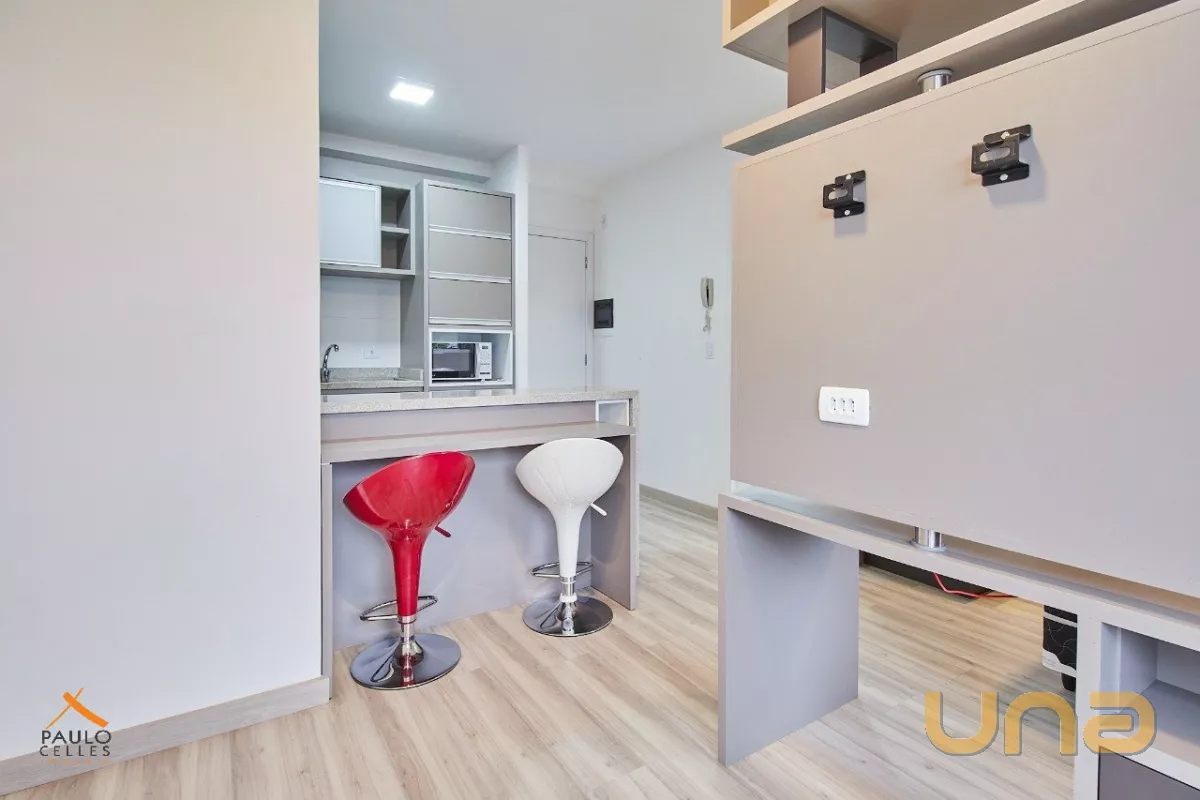 O apartamento possui 1 dormitório conjugado com a sala, cozinha com armário, cooktop e geladeira, além de sacada, área de serviço e banheiro com armários e box.