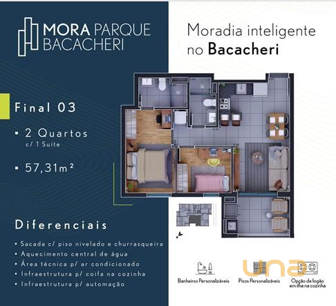 Detalhes: Excelente apartamento ao lado do Parque Bacacheri, cercado por natureza, tranquilidade e qualidade de vida. O imóvel contém sala com cozinha integrada, ampla sacada com churrasqueira a carvão e pia, banheiro social, suíte e mais um quarto, estrutura de automação preparada e compatível com Alexa e Google Home, forro de gesso em todo apartamento, pontos para ar-condicionado (sala e suíte), infraestrutura para coifa. Vaga de garagem livre demarcada n° 16.
