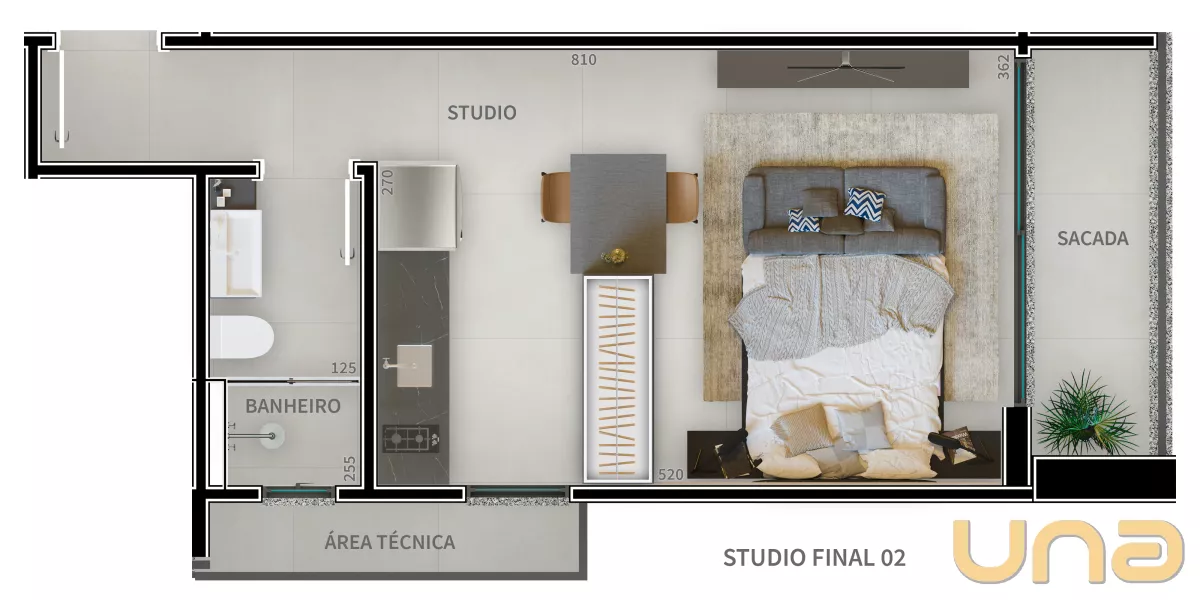Apartamento com 34,82m² privativos, 01 quarto, cozinha, banheiro, sacada e 01 vaga de garagem.