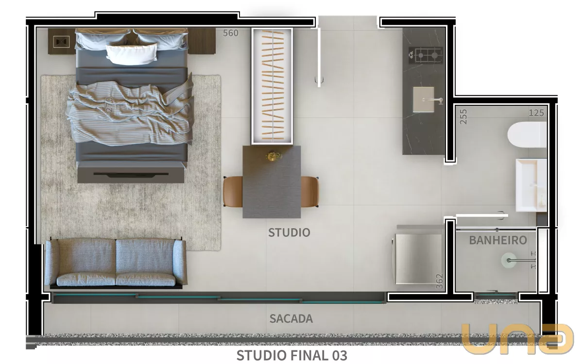Studio com 34,79m² privativos, 01 quarto, cozinha, banheiro e sacada.