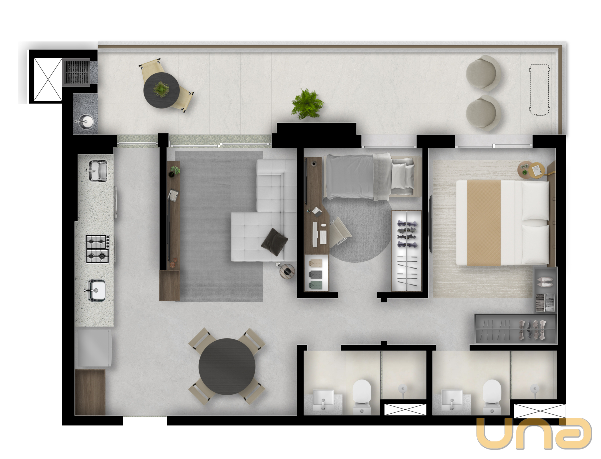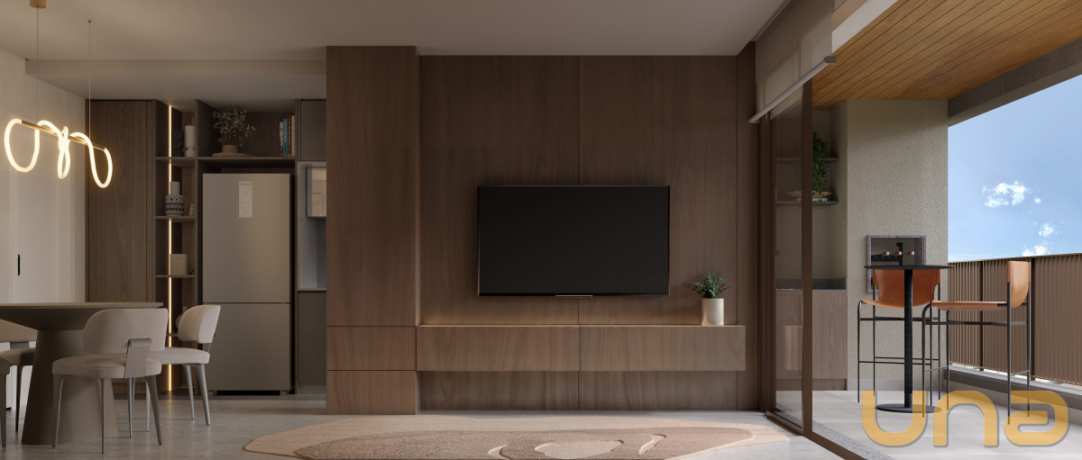 O apartamento conta com 2 quartos, sendo 1 suíte, varanda com churrasqueira a carvão e 1 vaga de garagem. O projeto foi pensado para garantir conforto e privacidade, com isolamento acústico reforçado nas lajes e tubulações.