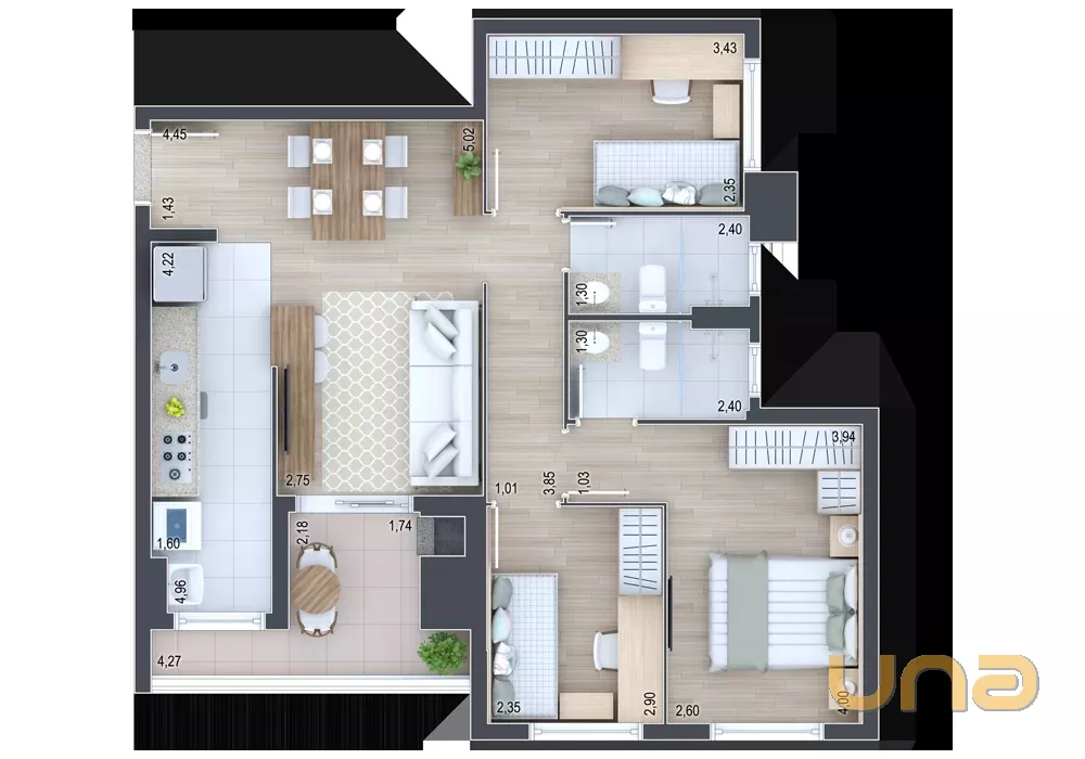O apartamento possui 3 quartos (1 suíte), sala para dois ambientes, sacada com churrasqueira a carvão, infraestrutura para ar-condicionado nos dormitórios e na sala, além de 1 vaga de garagem.