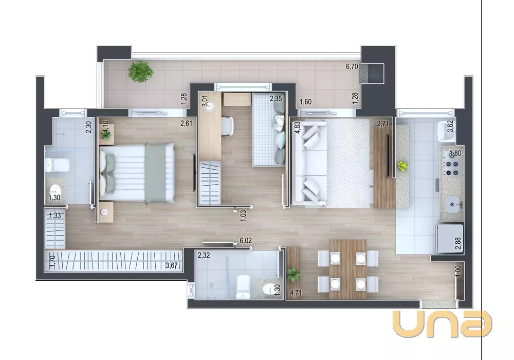 O apartamento possui 2 quartos (1 suíte), sala para dois ambientes, sacada com churrasqueira a carvão, infraestrutura para ar-condicionado nos dormitórios e na sala, além de 1 vaga de garagem.