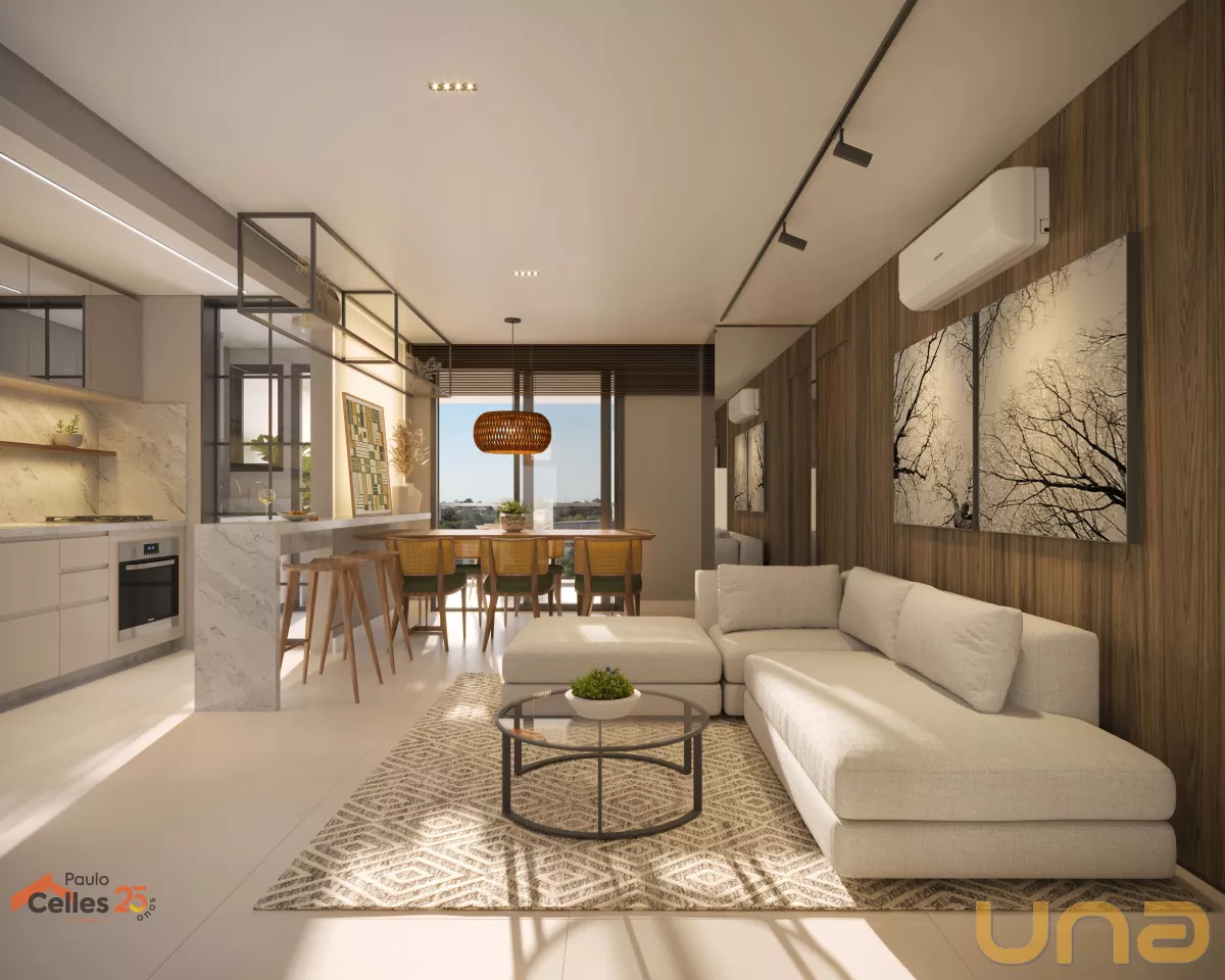 Apartamento com 2 quartos, sendo 1 suíte, 70 m² privativos, sala para dois ambientes e sacada com churrasqueira a carvão. Dispões de 1 vaga de garagem e infraestrutura para abastecimento de carros elétricos, com um ponto exclusivo por apartamento.