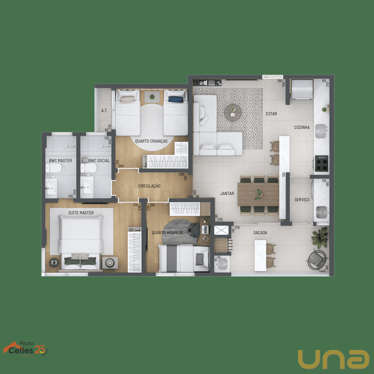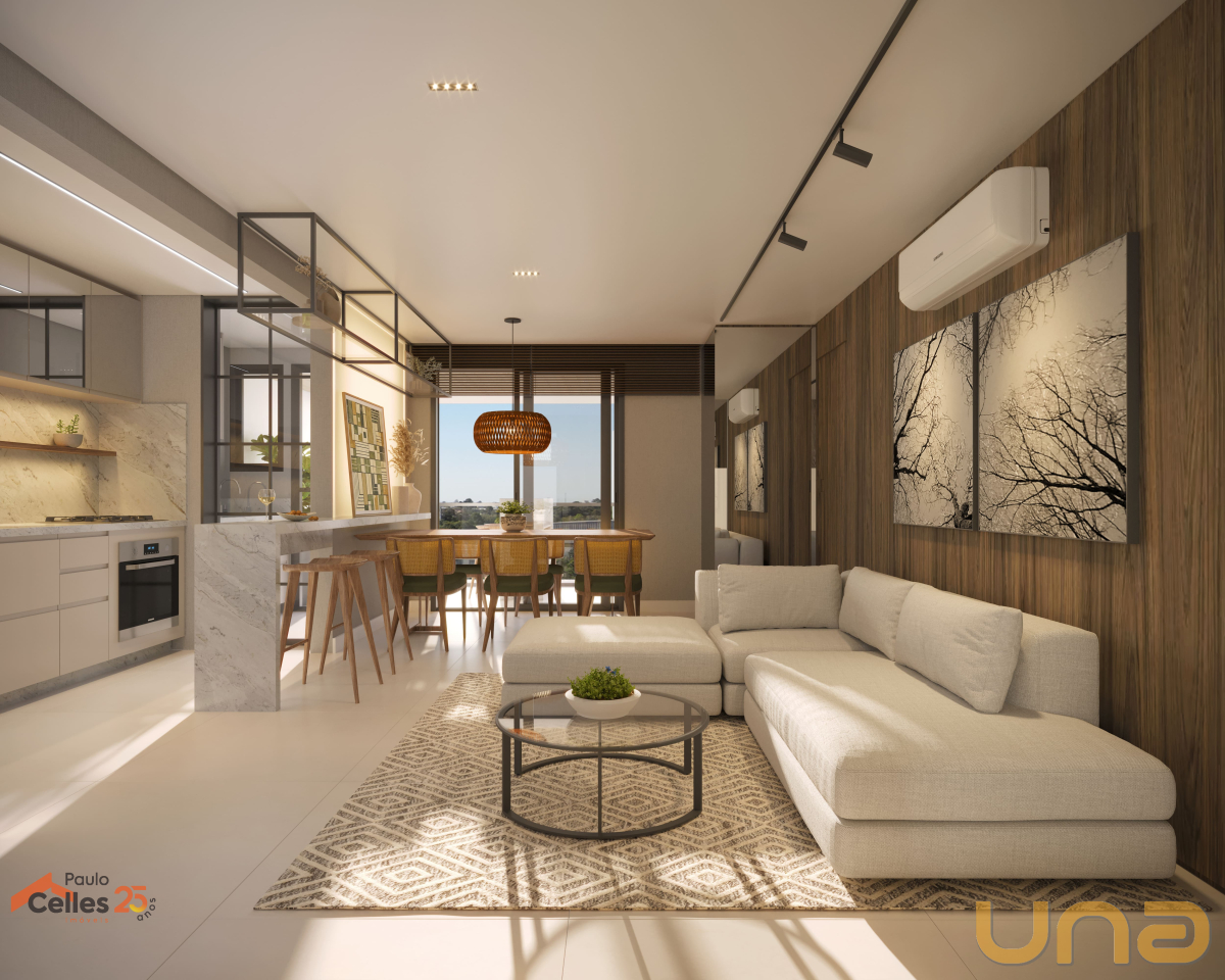 Apartamento com 3 quartos, sendo 1 suíte, 80 m² privativos, sala para dois ambientes e sacada com churrasqueira a carvão. Dispõe de 2 vagas de garagem, armário privativo e infraestrutura para abastecimento de carros elétricos, com um ponto exclusivo por apartamento.