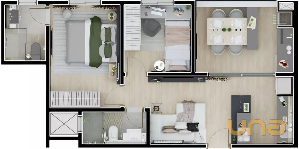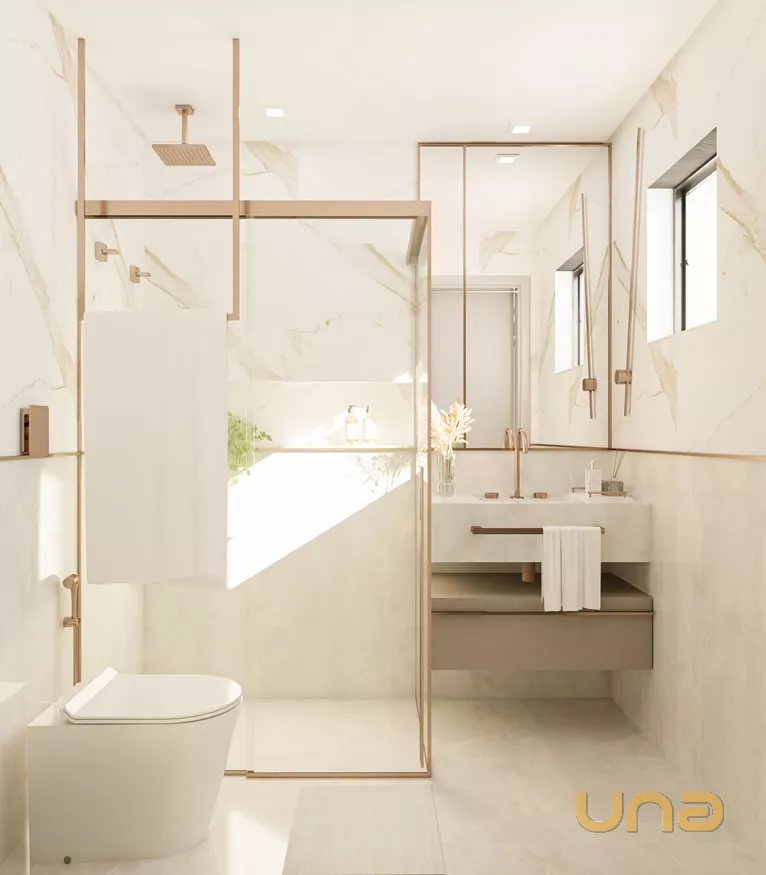 Apartamento de 56m² no Concept Le Monde, com 2 quartos (1 suíte), piso em porcelanato nas áreas molhadas, janelas com persiana integrada, banheiro com bancada em granito e churrasqueira a carvão.