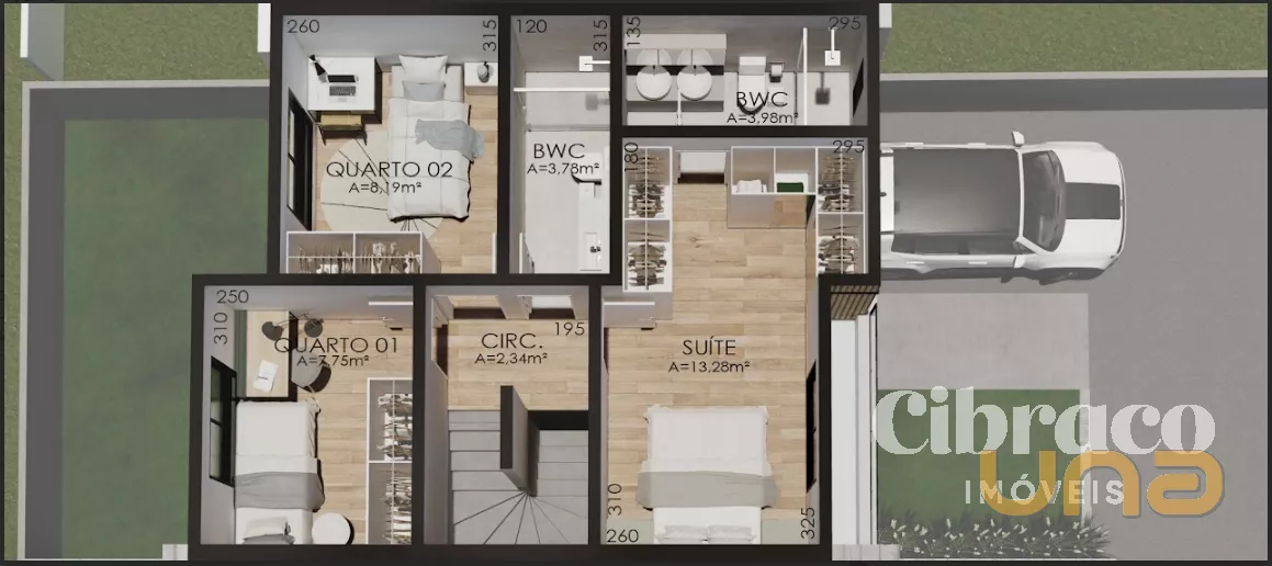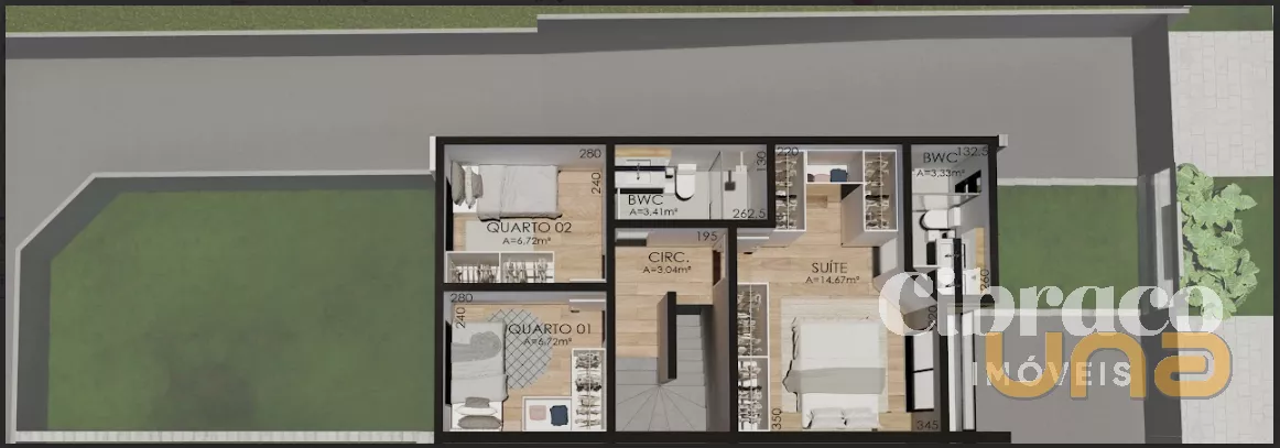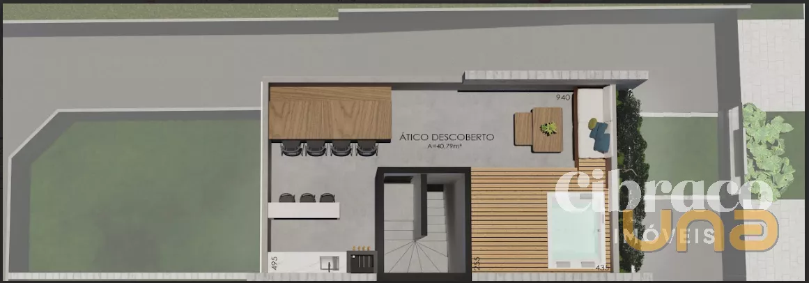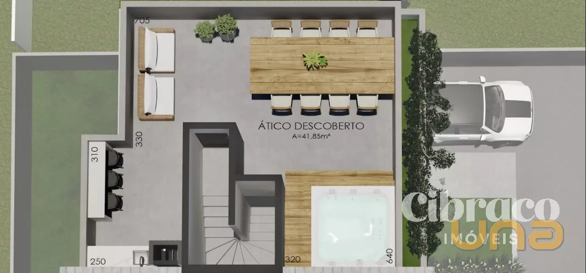 No pavimento superior há 3 quartos sendo 1 suíte, ático com terraço e churrasqueira privativa.