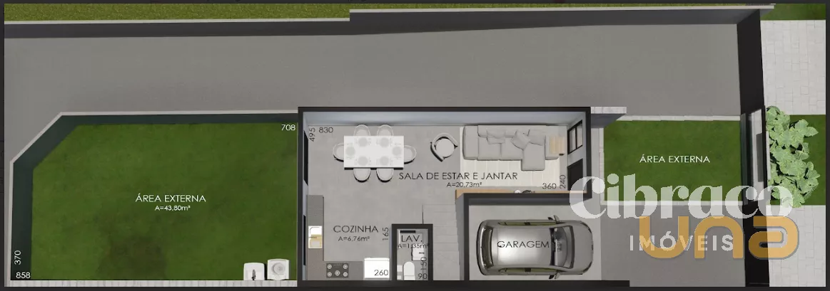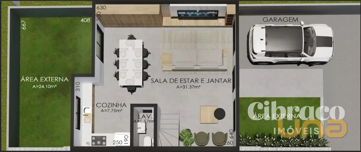 Contendo: Sala de estar, sala de jantar, lavabo, cozinha e área externa com jardim.