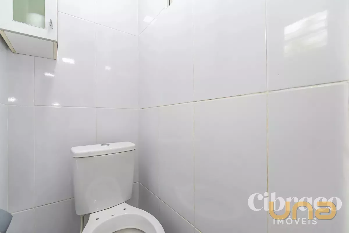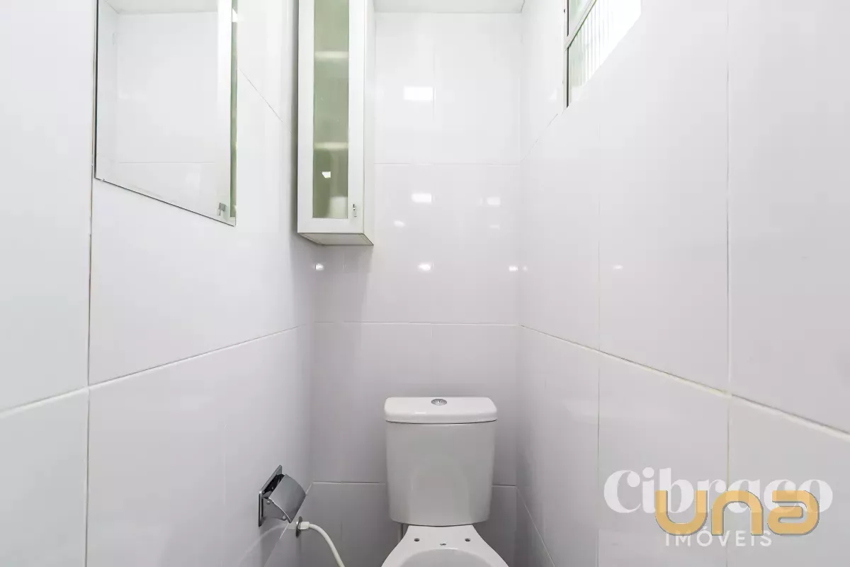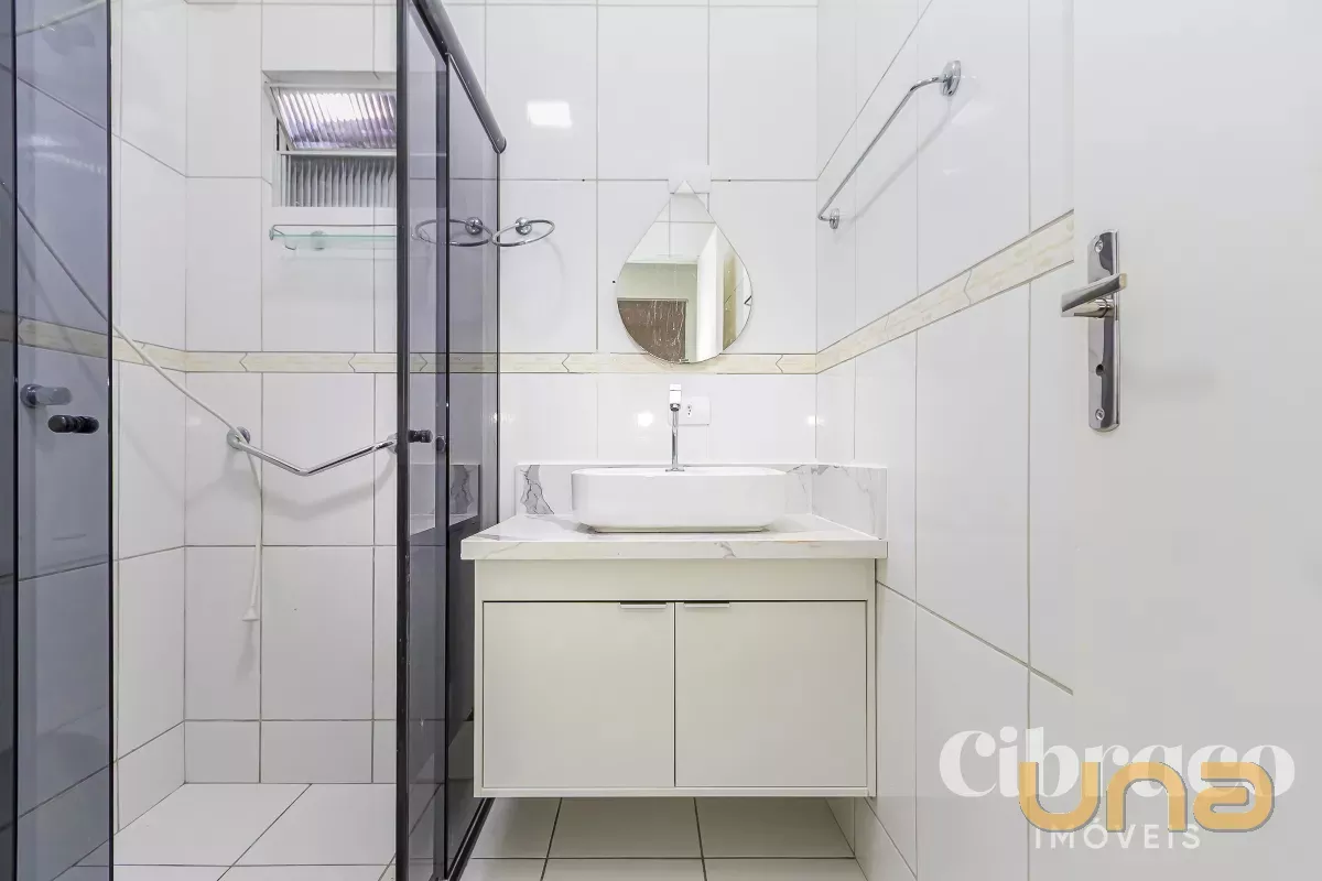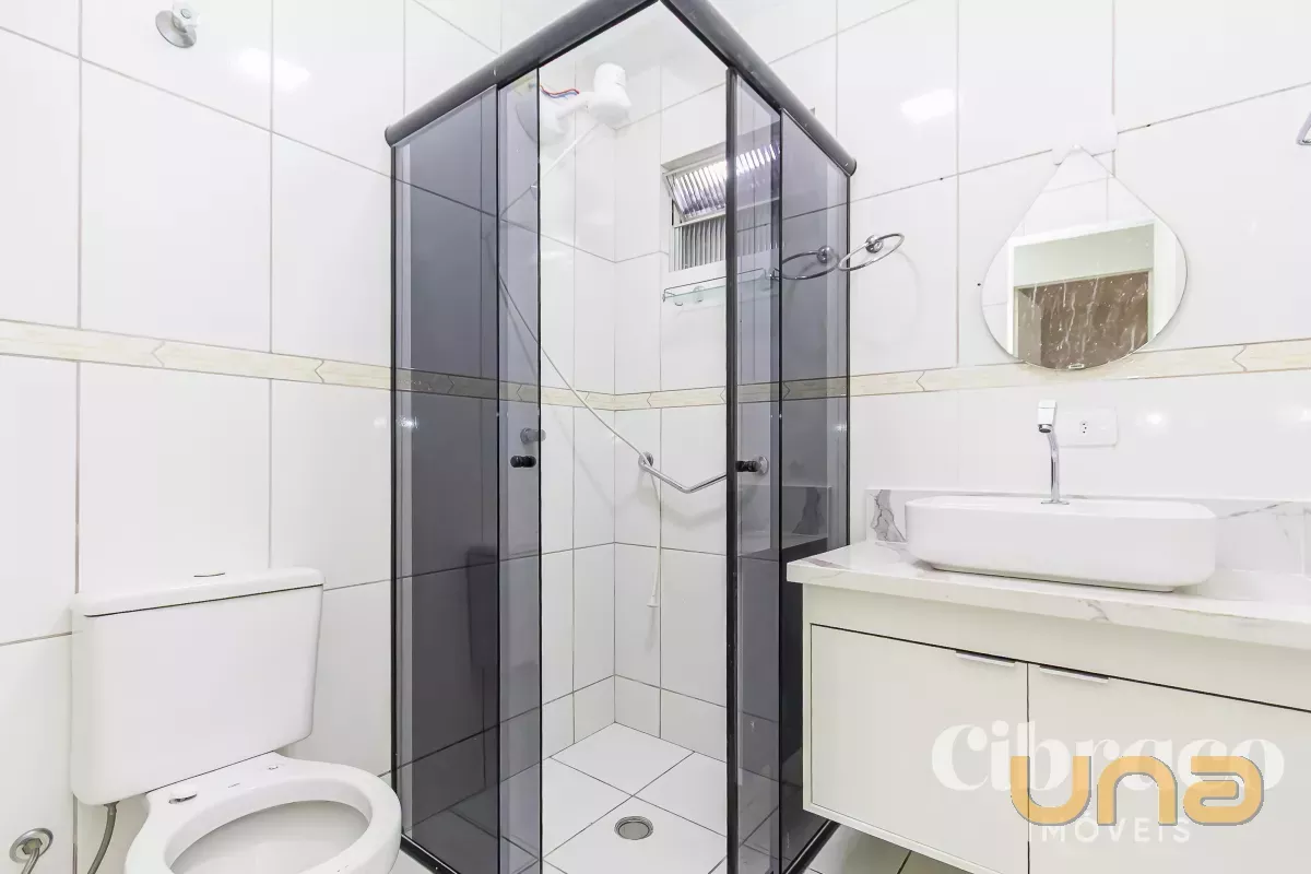 Banheiro com armário e box Blindex.