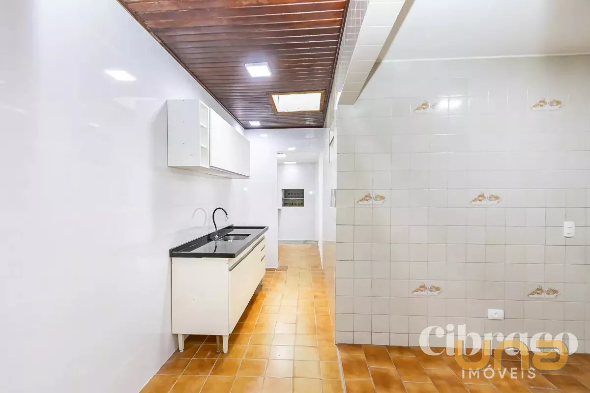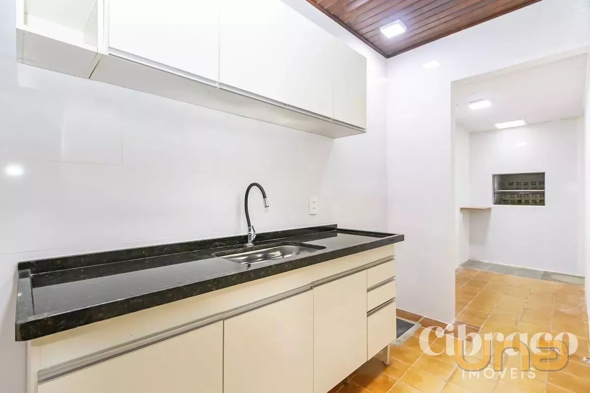 Cozinha com armários e pia em granito;