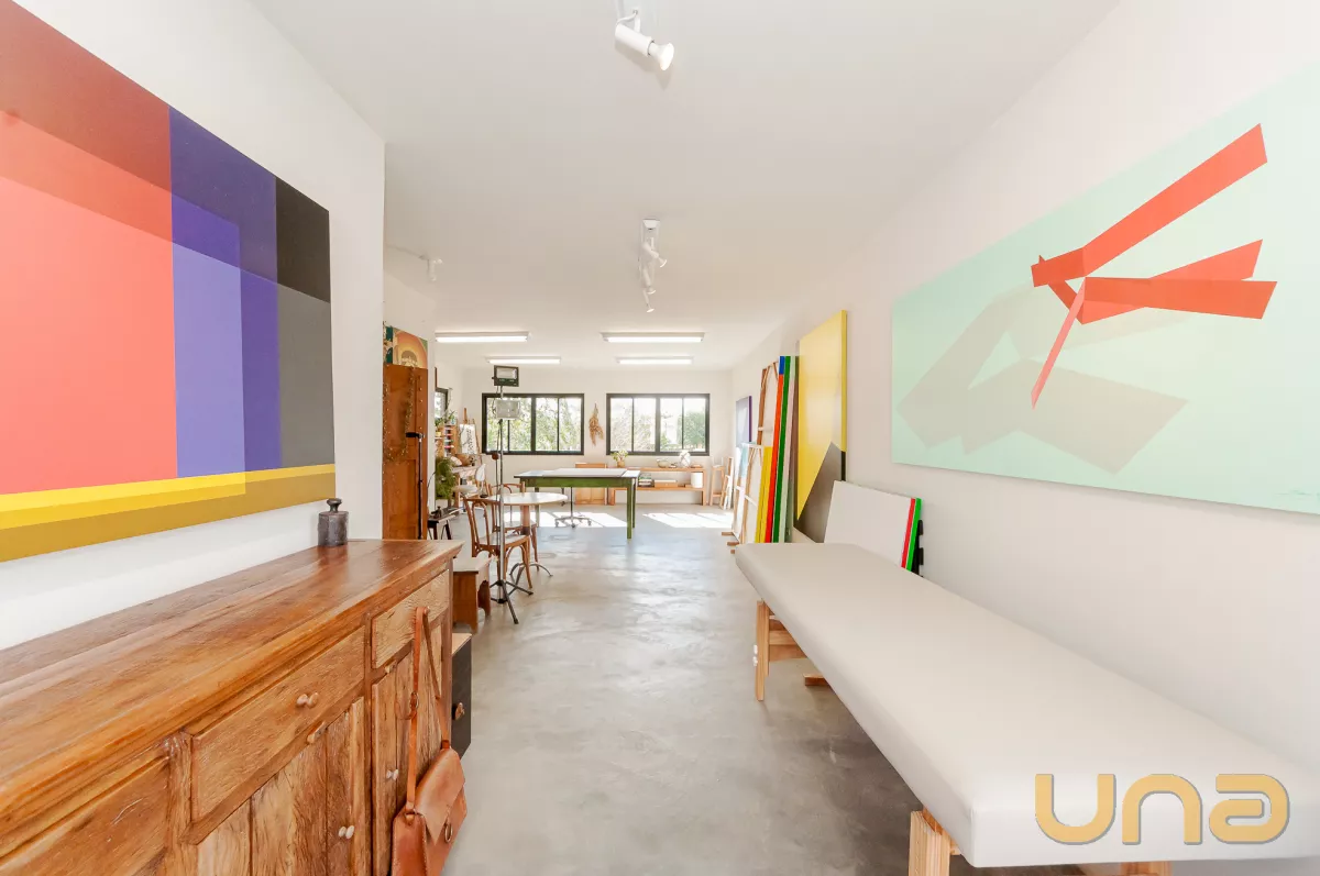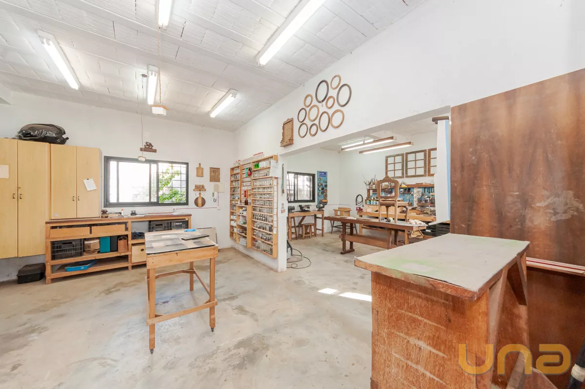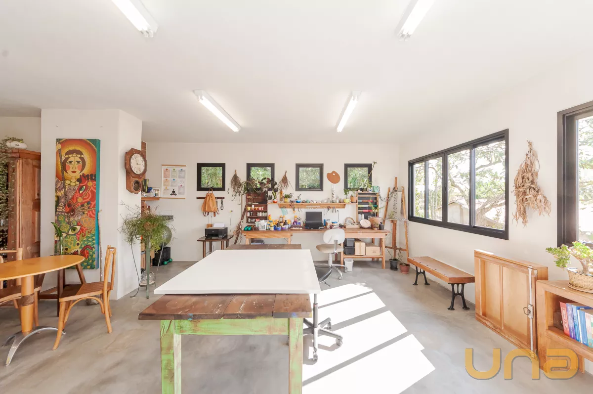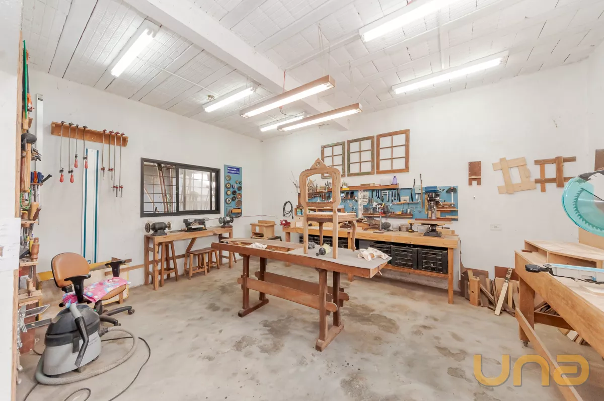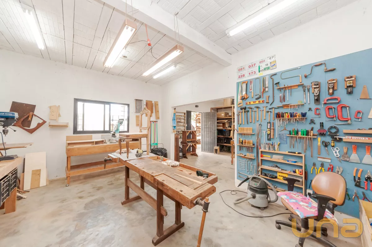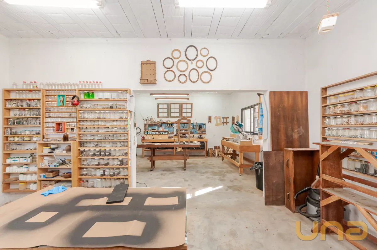 Na parte inferior a essas construções com 104,80m², possui uma ampla área gourmet com churrasqueira e banheiro, uma oficina distribuida em duas amplas salas e 2 vagas de garagem cobertas.