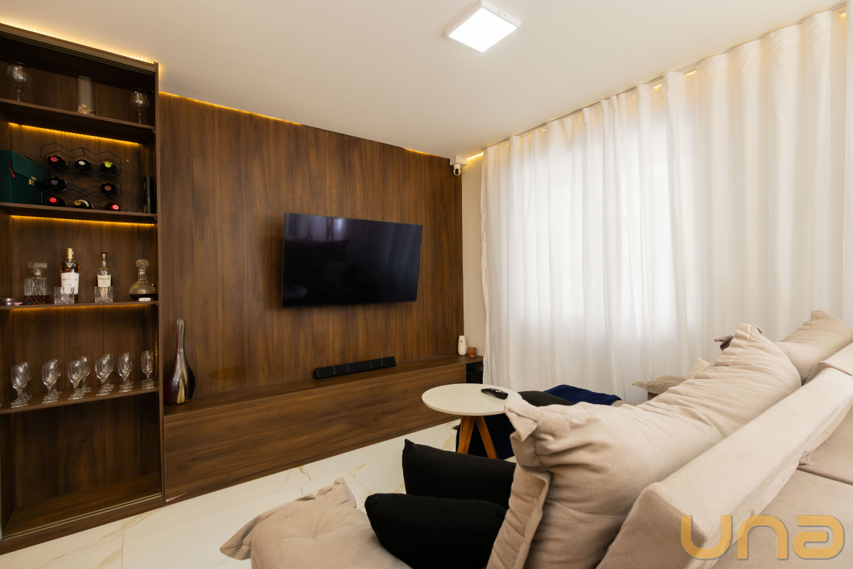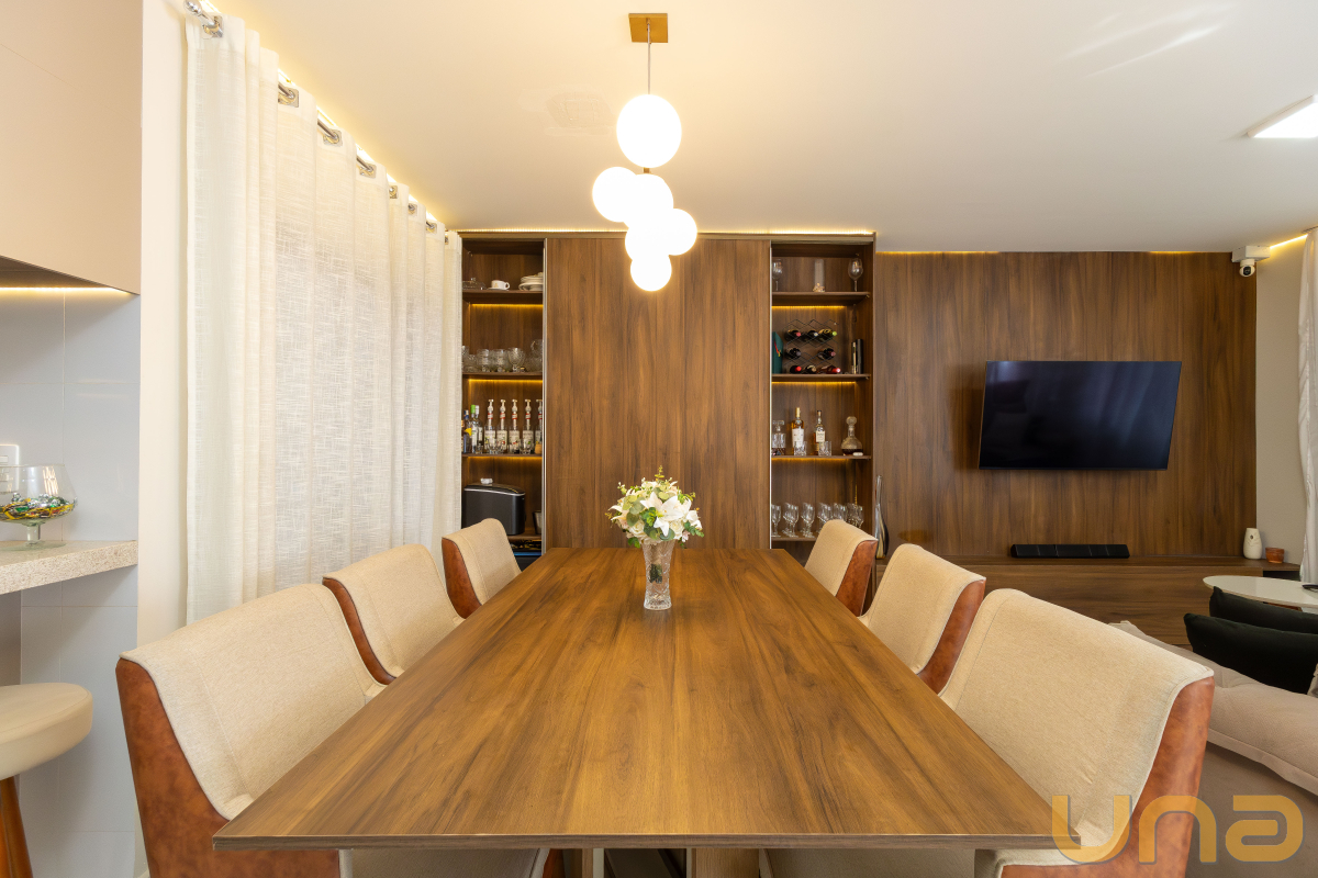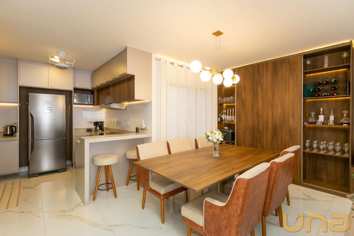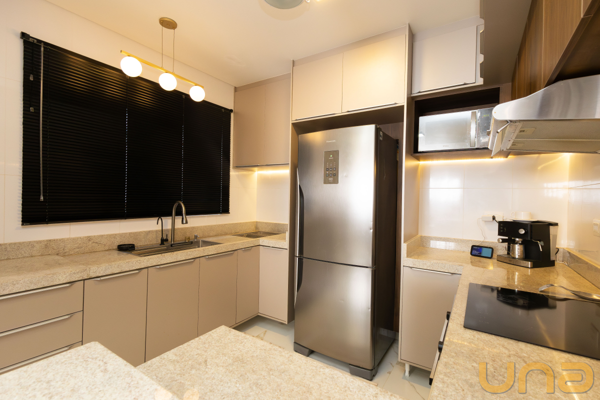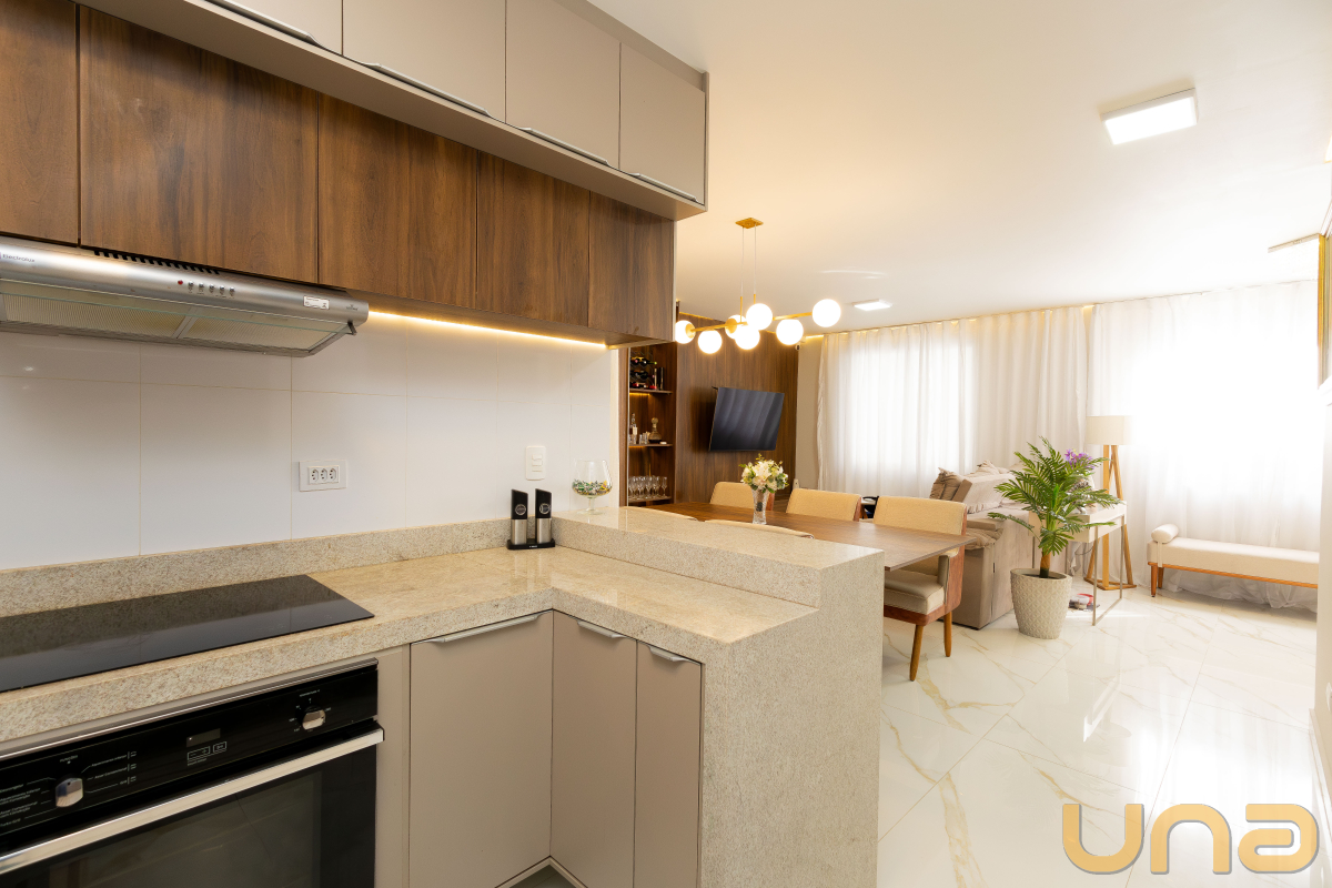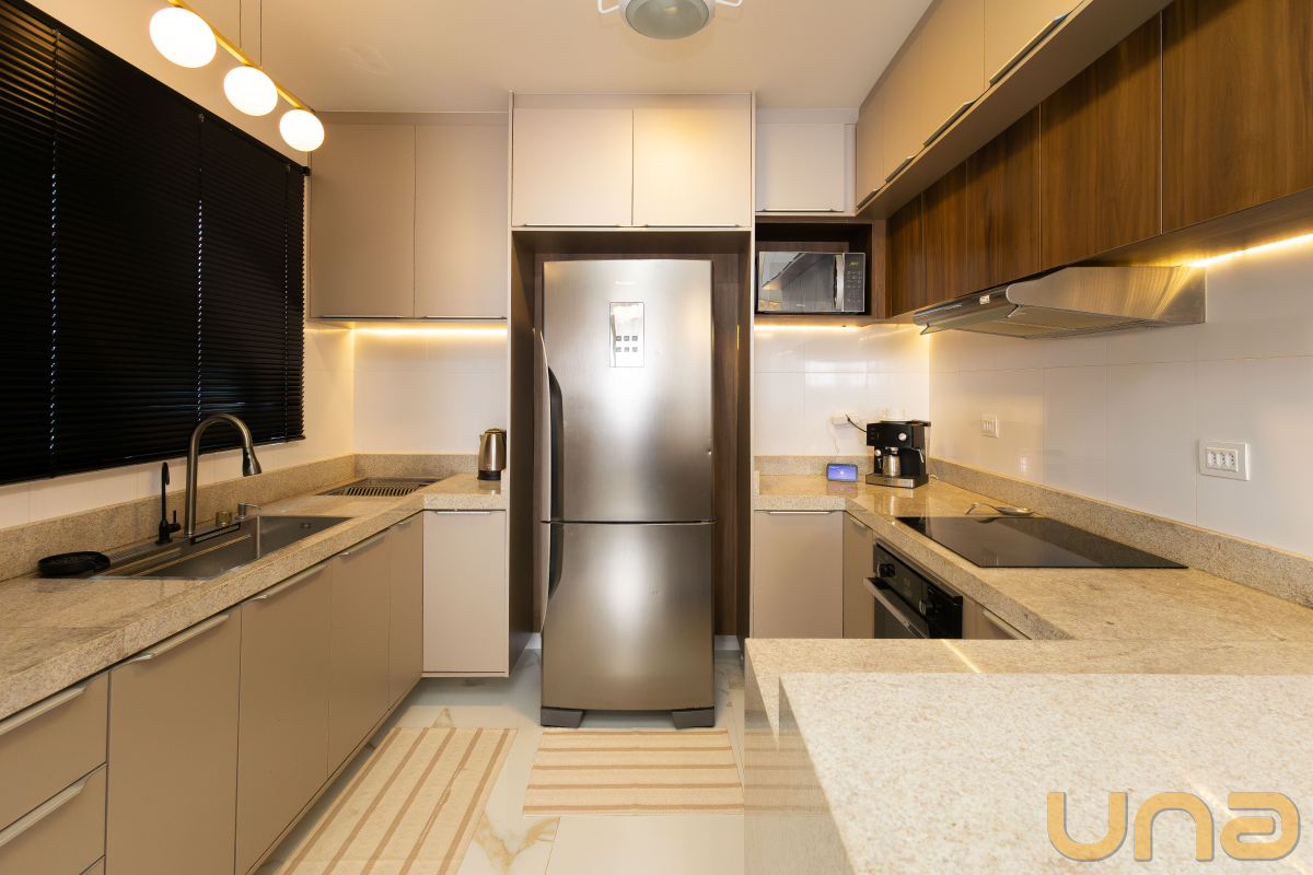 - Cozinha com armários planejados, cooktop, forno elétrico, calha úmida e lixeira embutida.