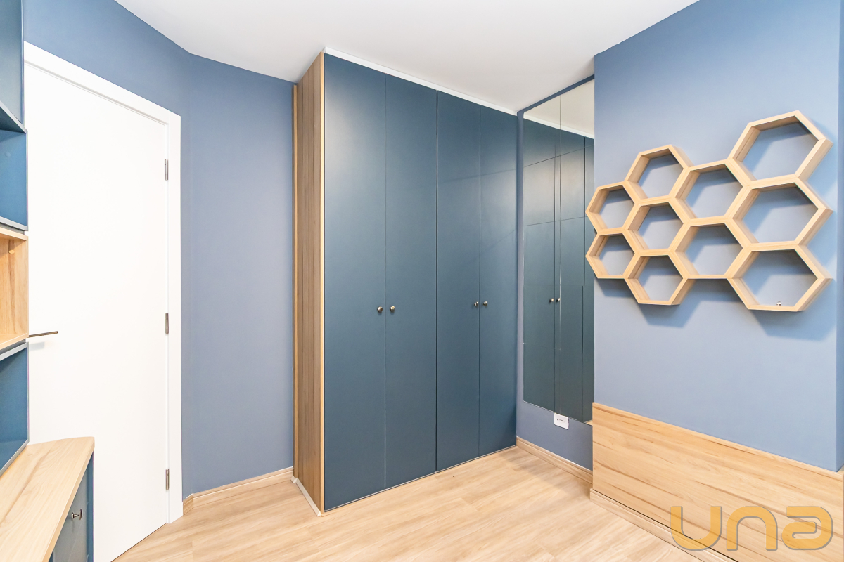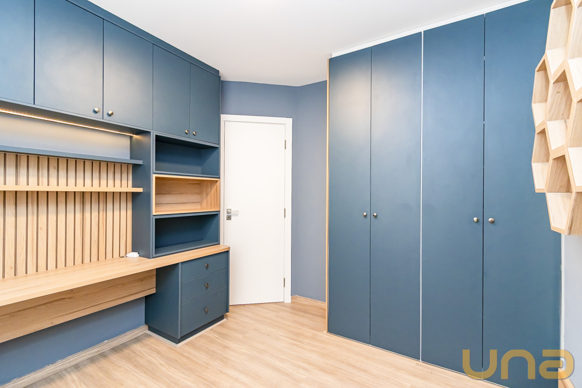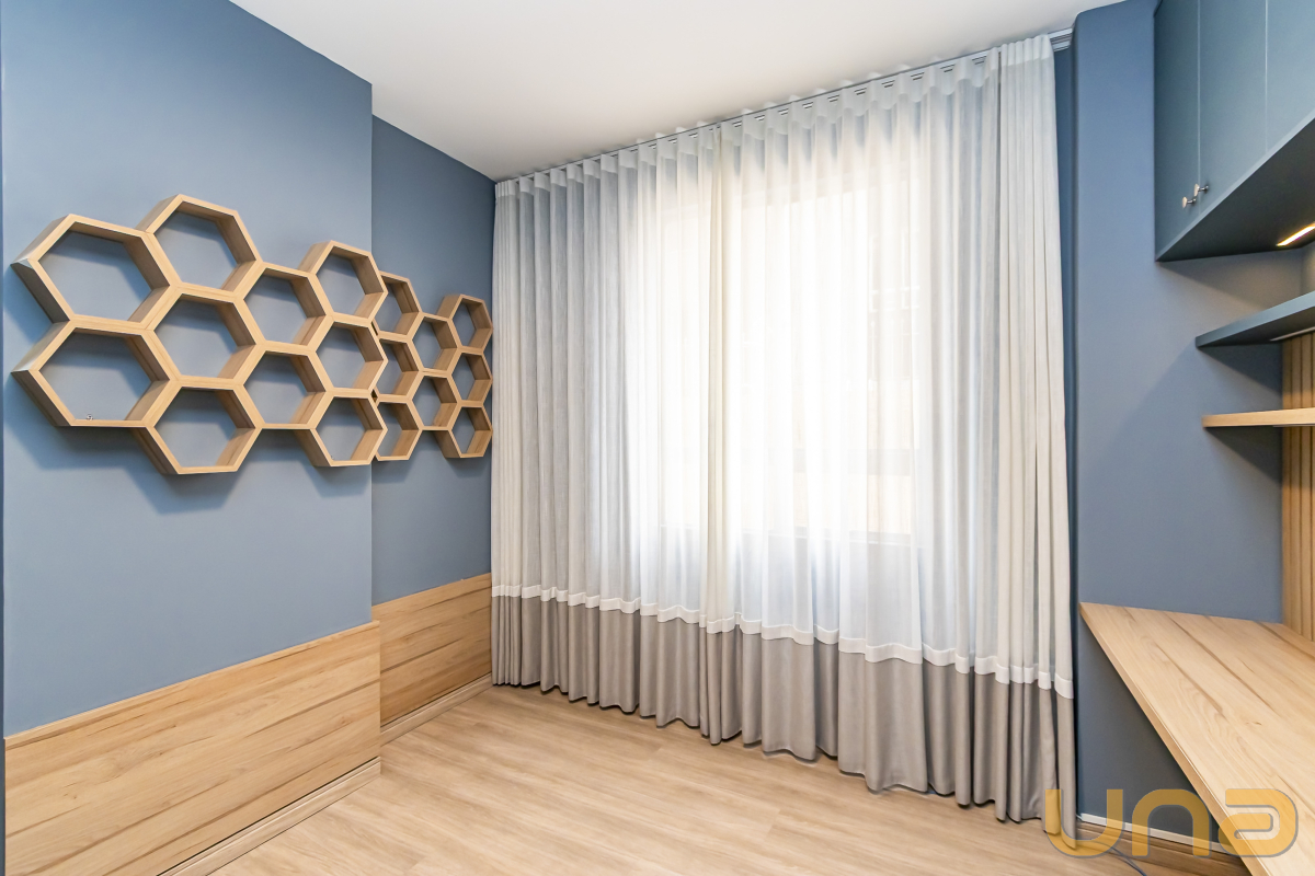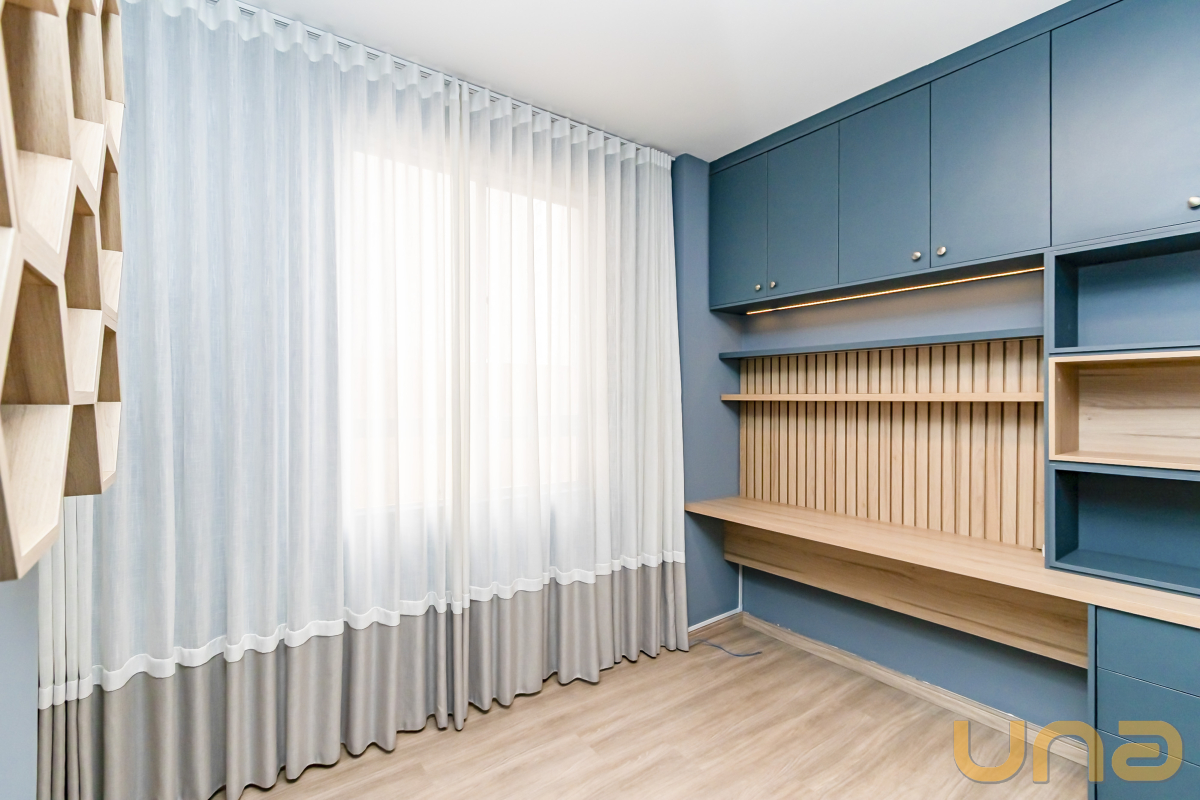 São três dormitórios, todos com armários planejados, sendo uma suíte e dois quartos com bancadas de estudo.
