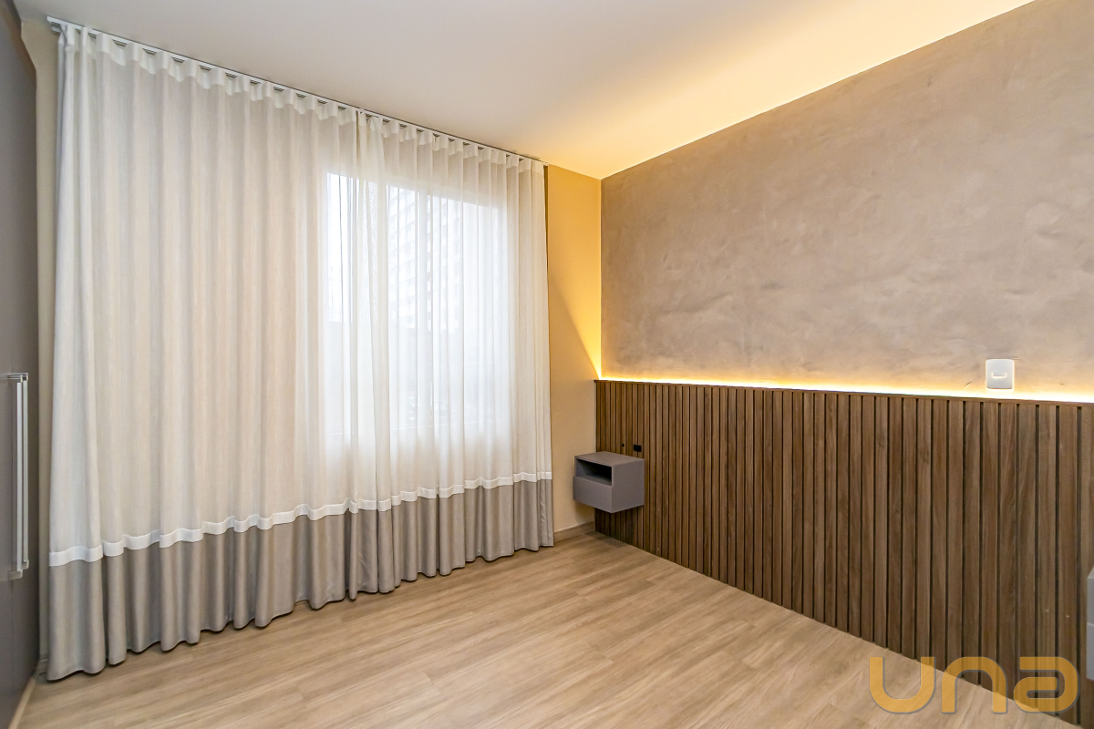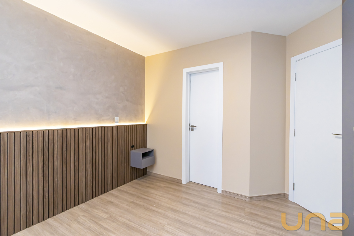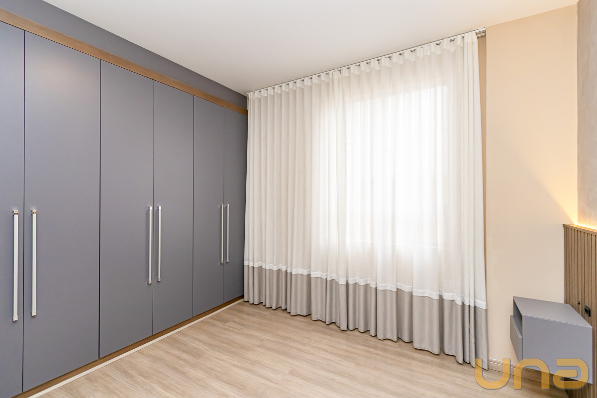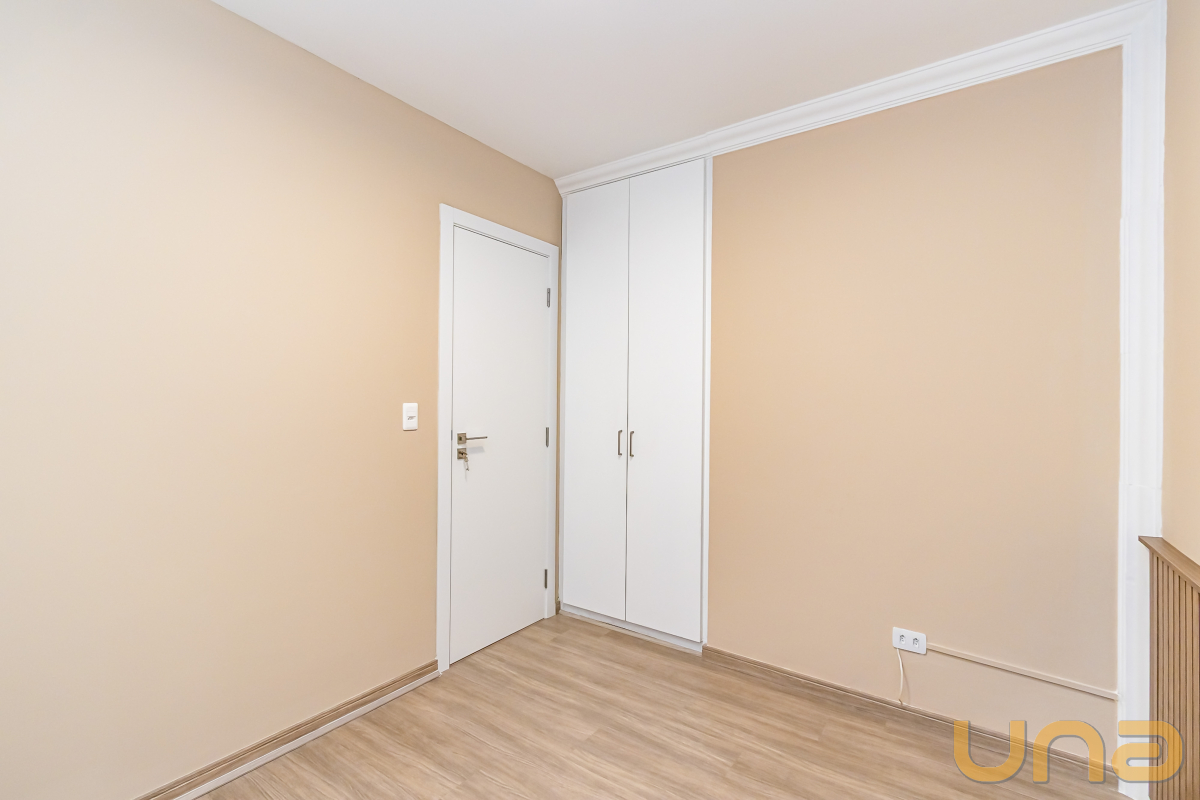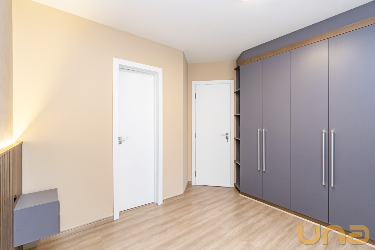 São três dormitórios, todos com armários planejados, sendo uma suíte e dois quartos com bancadas de estudo.