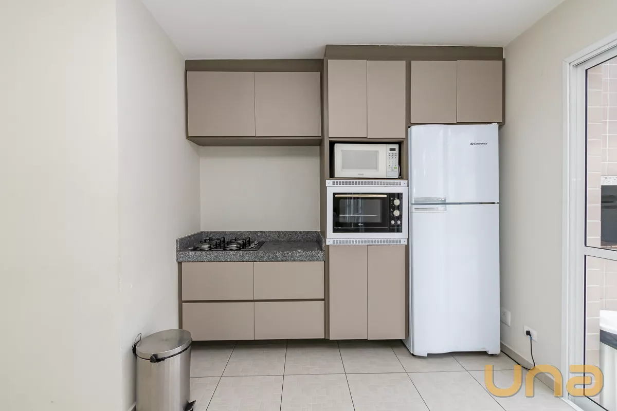 Ótimo apartamento estilo stúdio com piso de cerâmica, cozinha, sacada e banheiro.