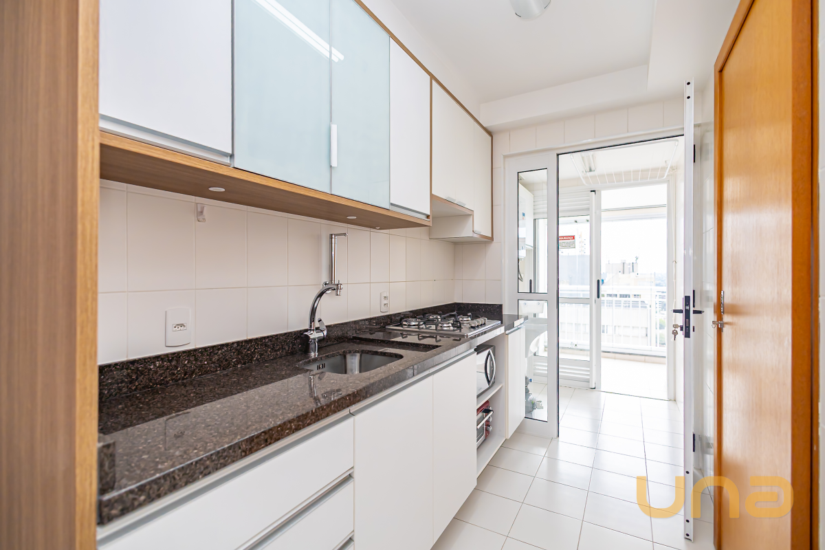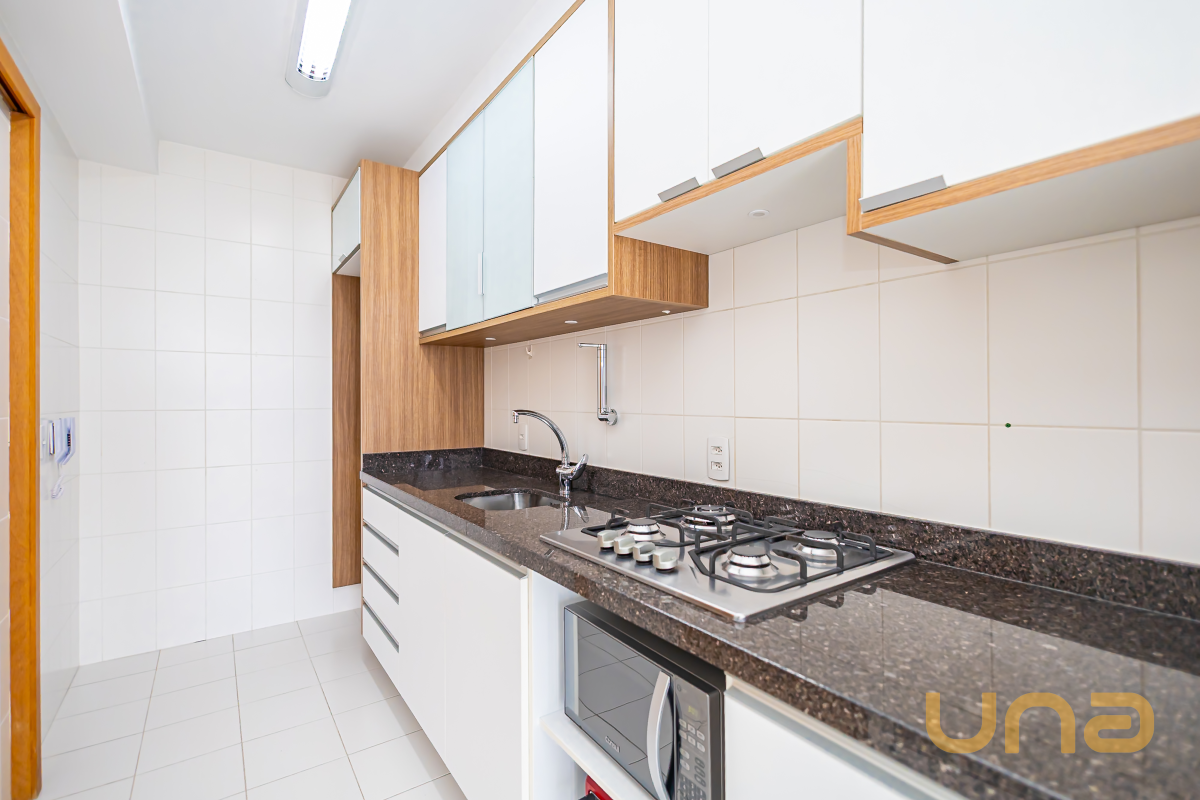 A cozinha é moderna e prática, com armários planejados, forno, micro-ondas e filtro de água Decka, garantindo organização e praticidade.