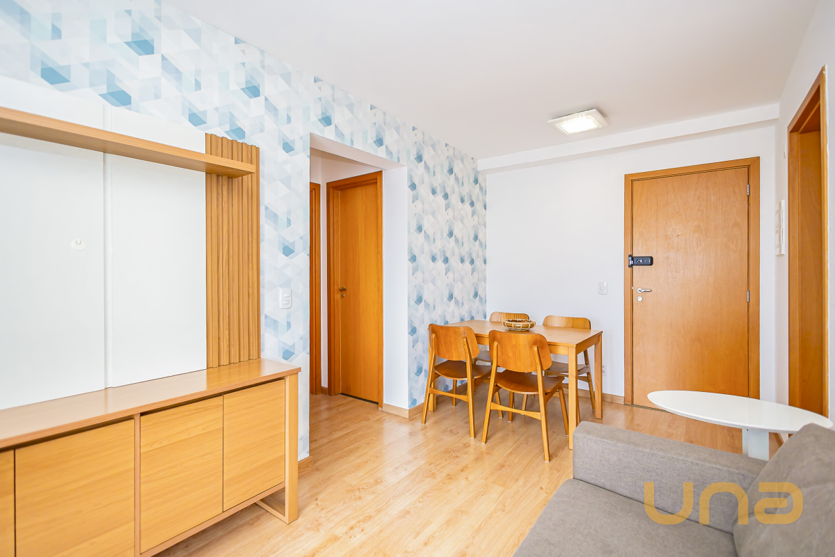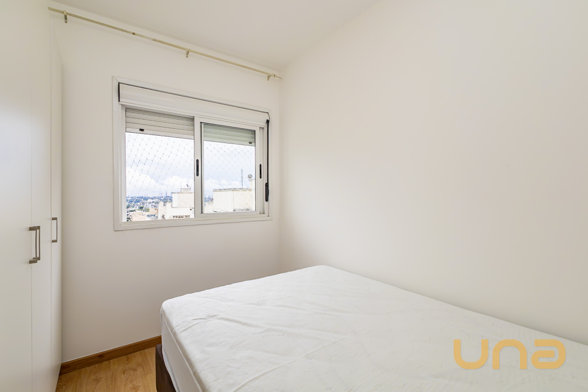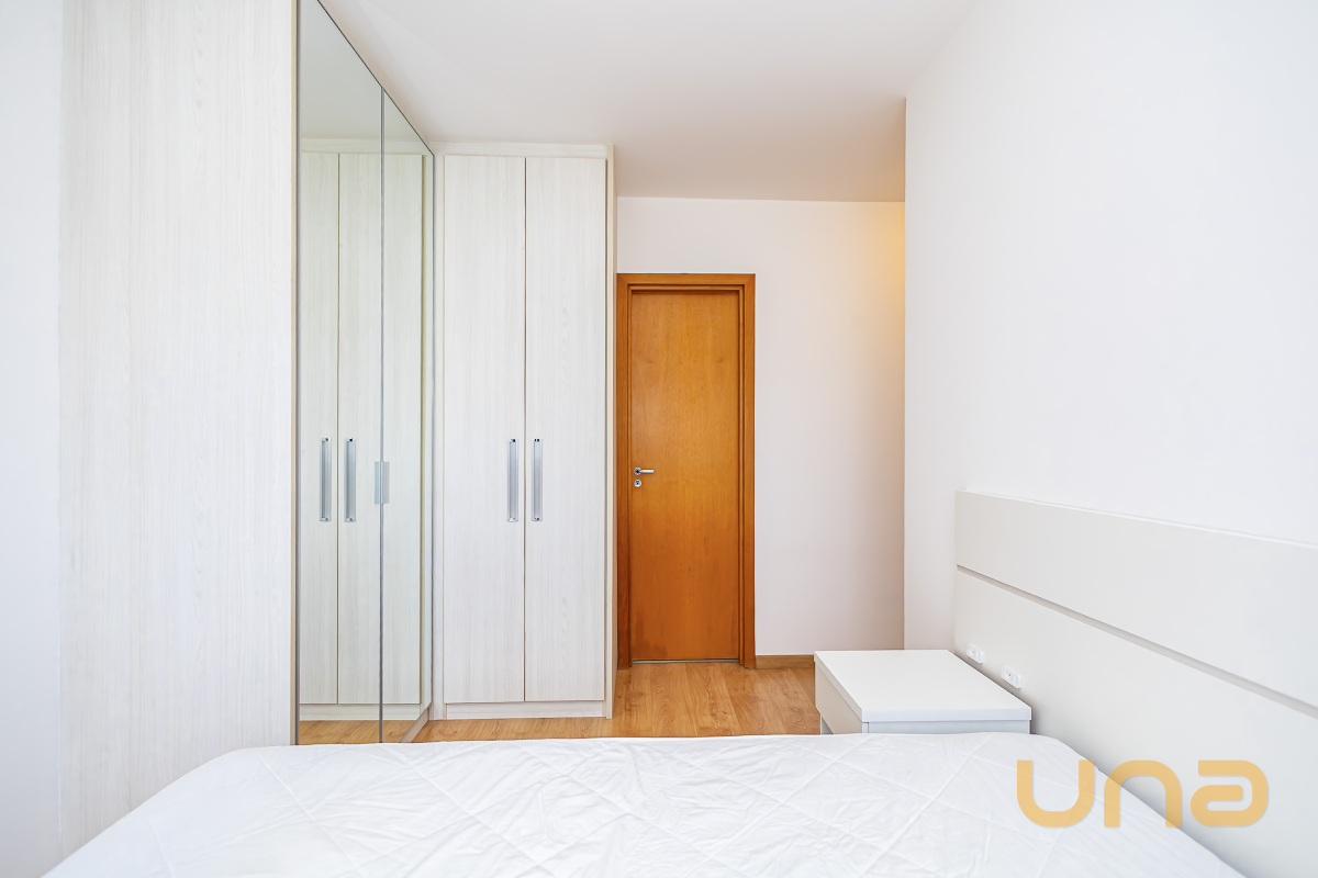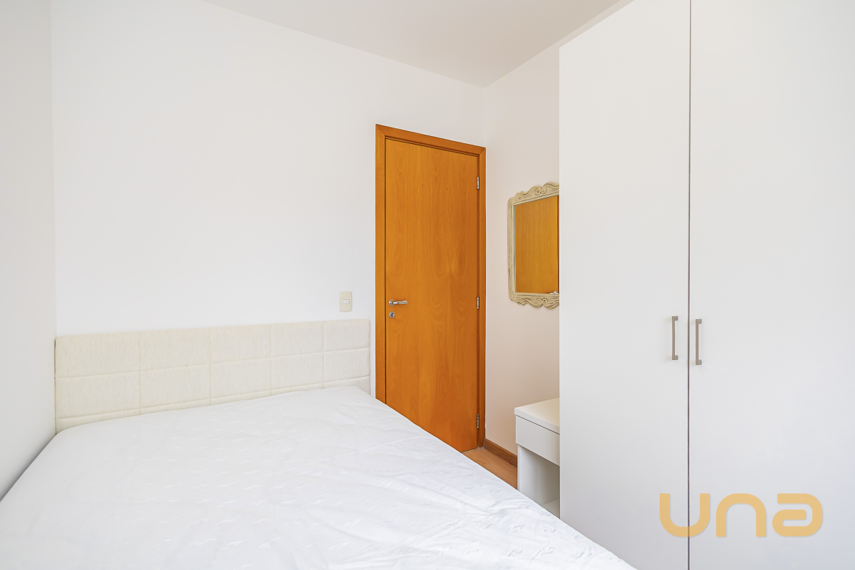 O apartamento conta com dois dormitórios, ambos com armários e camas, sendo um deles uma suíte. A área de serviço é separada e também equipada com armários, proporcionando mais comodidade e espaço para o dia a dia.