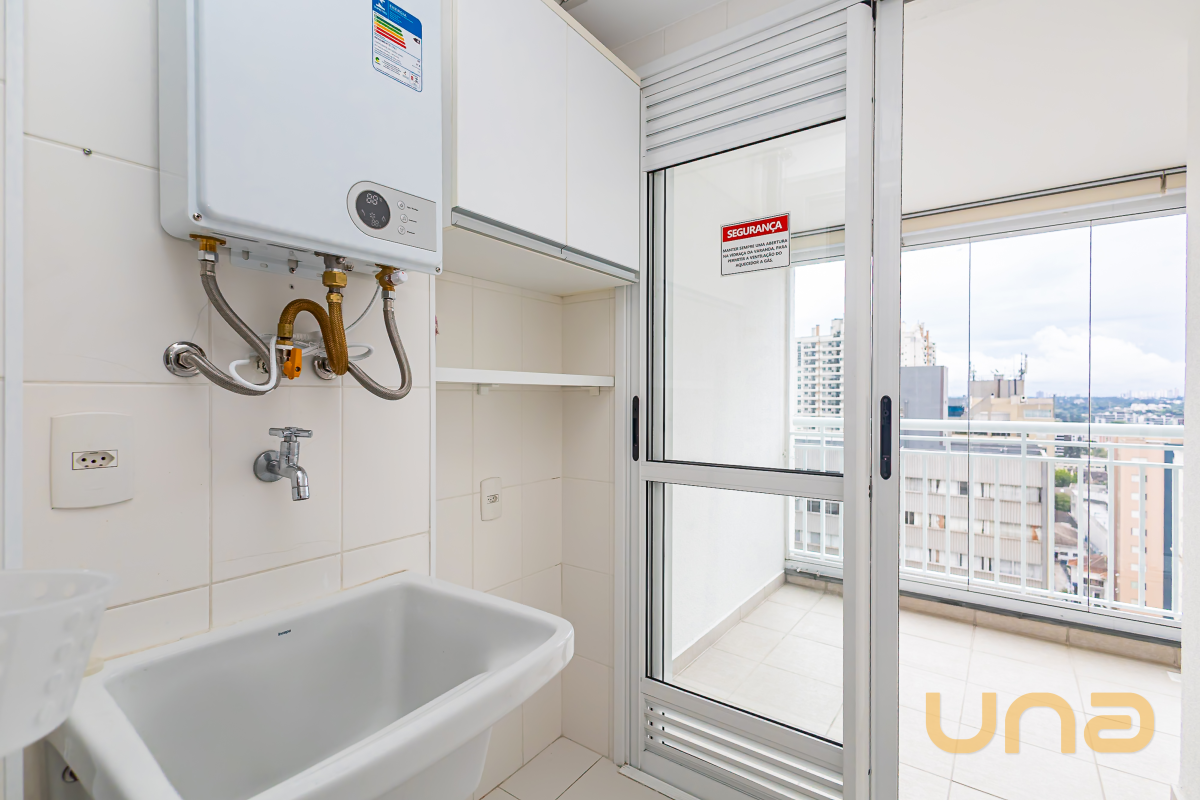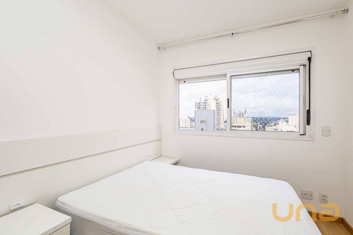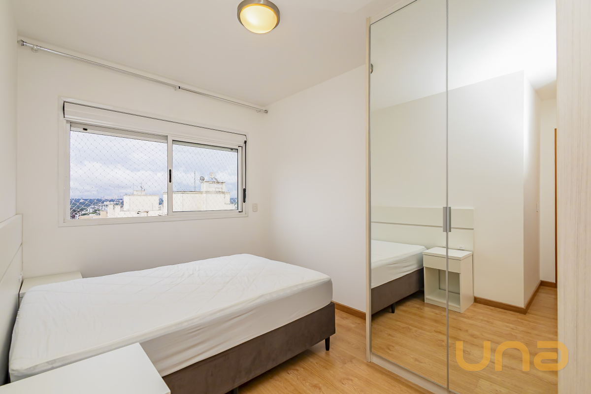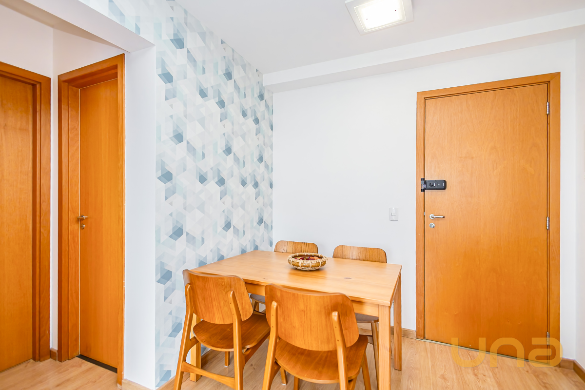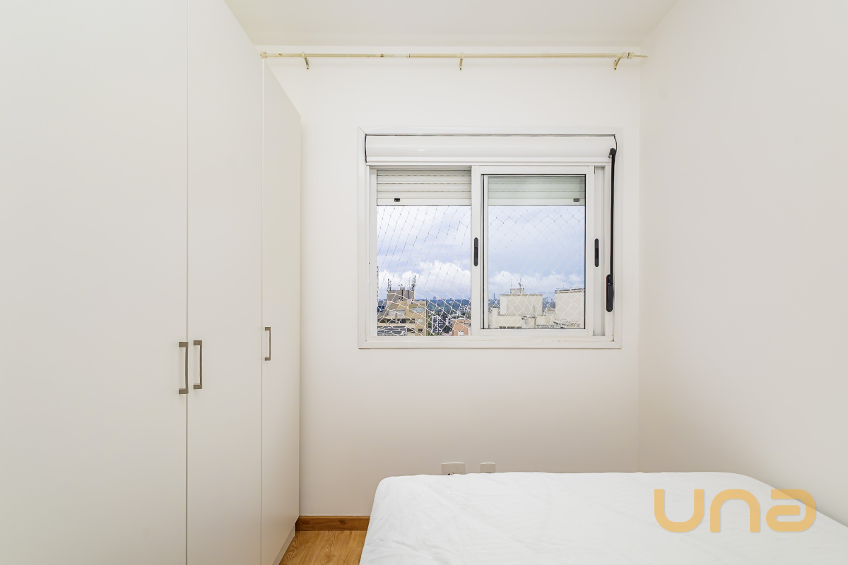 O apartamento conta com dois dormitórios, ambos com armários e camas, sendo um deles uma suíte. A área de serviço é separada e também equipada com armários, proporcionando mais comodidade e espaço para o dia a dia.
