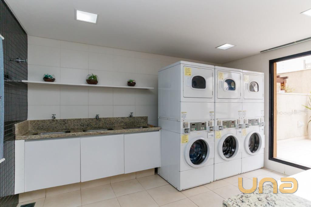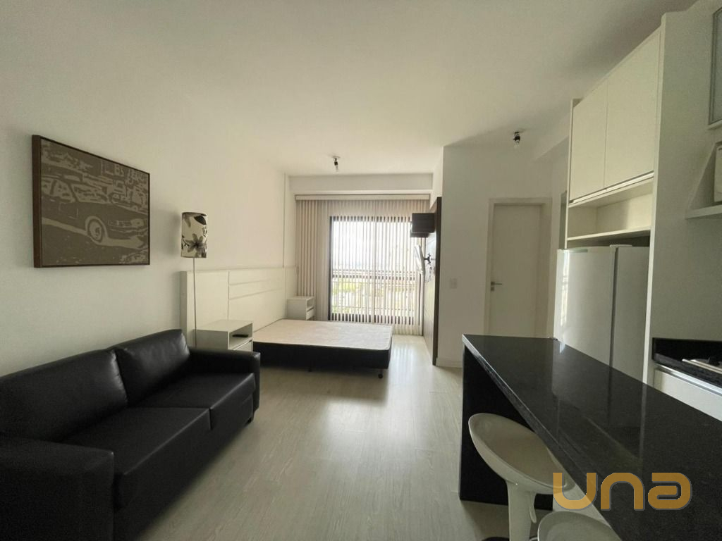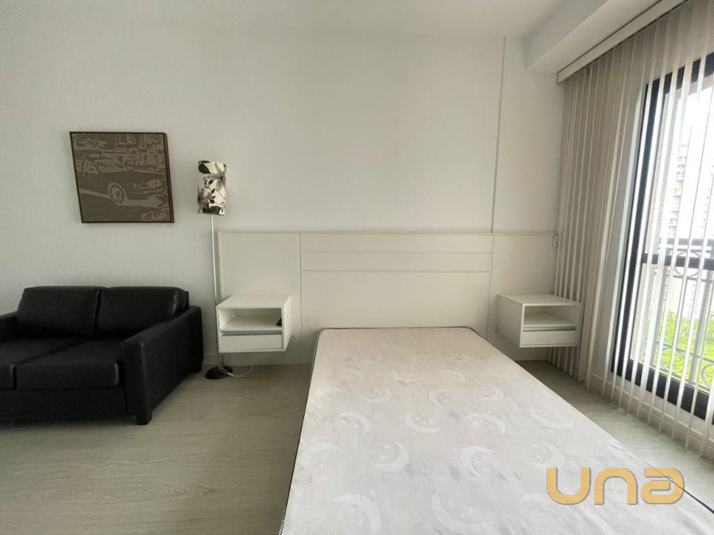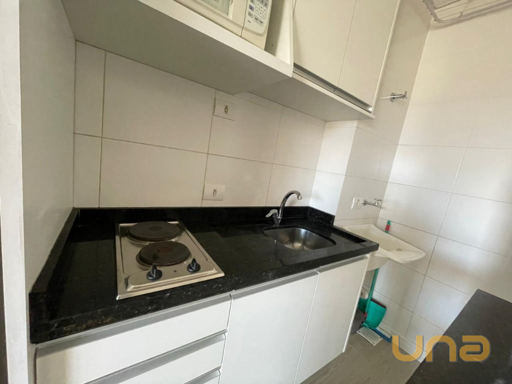 Apartamento com vista ampla, localizado no último andar do edifício Moving Home Space. Possui armários planejados, TV, sofá, cozinha equipada com geladeira, micro-ondas e cooktop, além de área de serviço com tanque e varal de teto. Não possui vaga de garagem, mas há estacionamentos próximos.