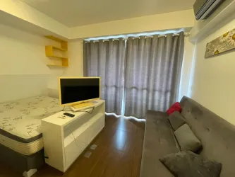 º Sala/quarto com sofá, cama box, guarda-roupas e TV