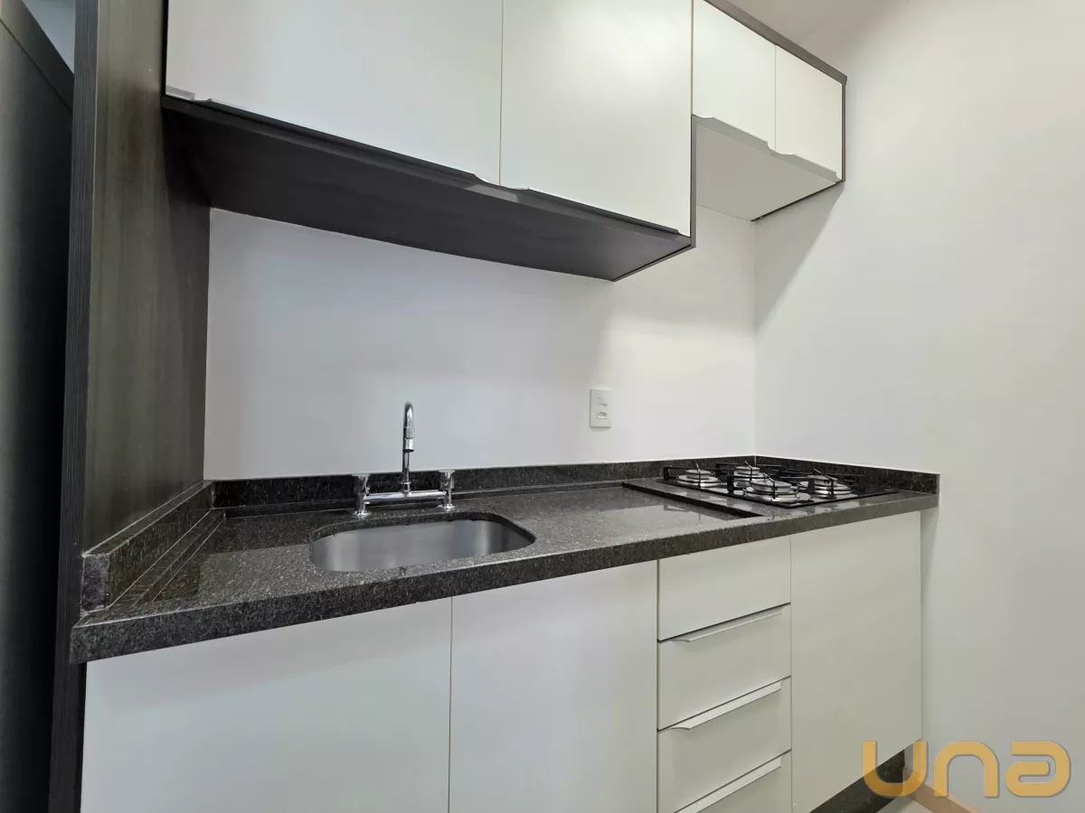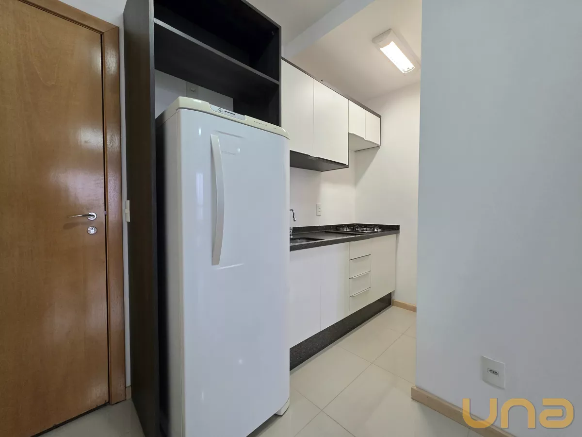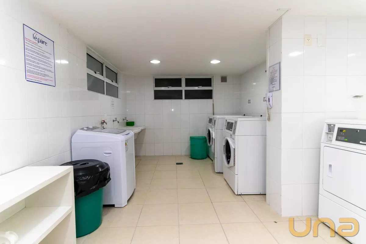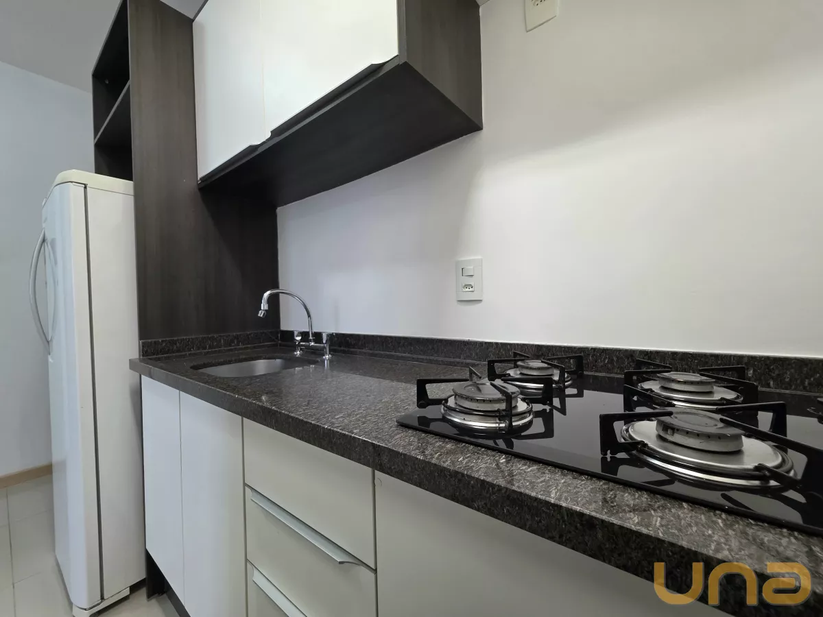 Contendo 1 dormitório com armário embutido, cama box de casal, sala para 2 ambientes com rack e painel com TV, cozinha com armário embutido, fogão cook top, geladeira, mesa, banheiro com box em vidro temperado, armário e espelho. O prédio oferece lavanderia de uso coletivo. O aquecimento de água para o chuveiro é através do sistema de caldeira.