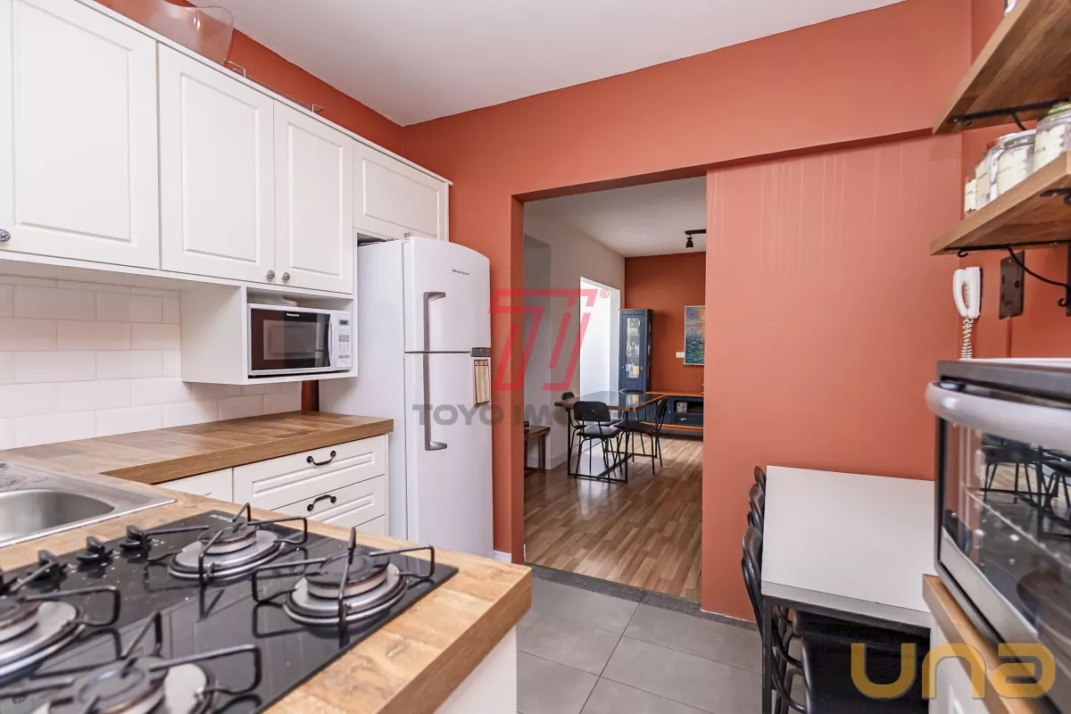 • Cozinha aberta com armários embutidos, prática e moderna;