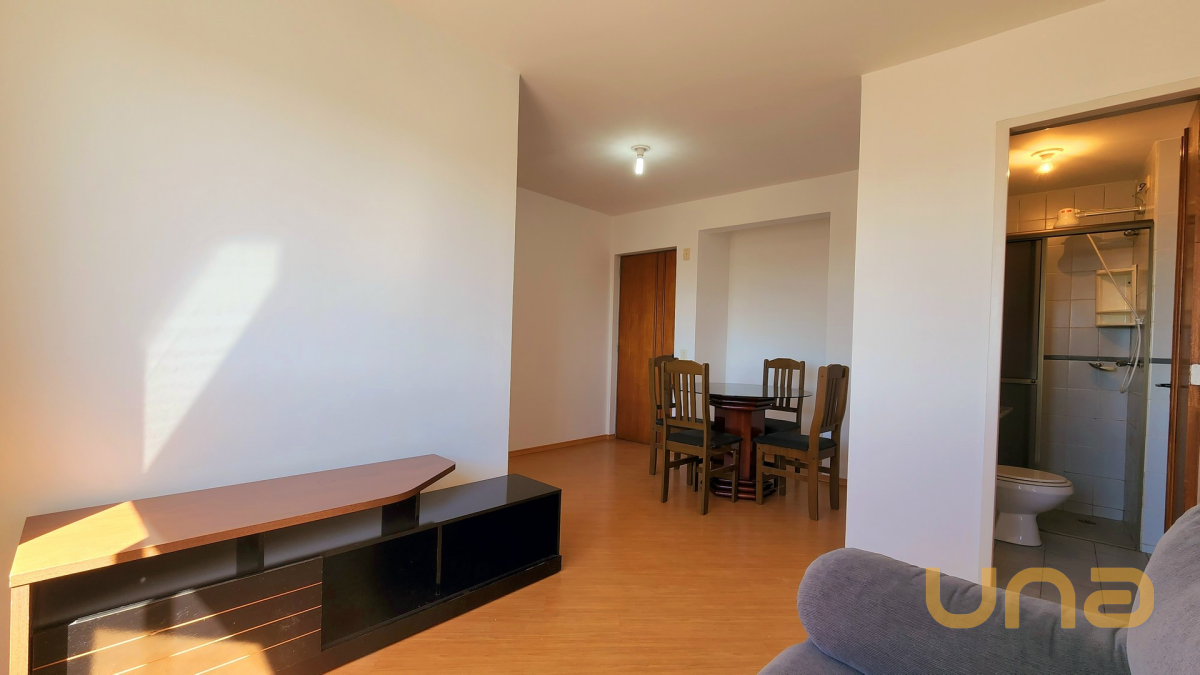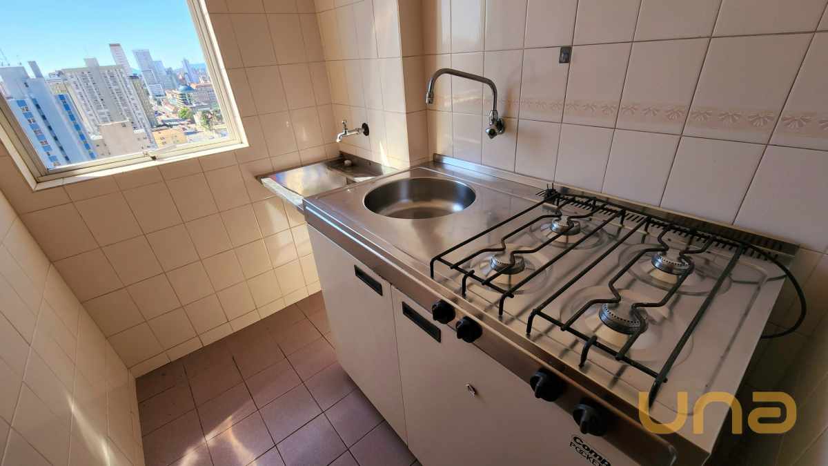 Este apartamento está no 15º andar, muito ensolarado e linda vista. Dividido em 1 dormitório com cama de casal, guarda roupa e cômoda, sala para 2 ambientes com sofá, rack e mesa com 4 cadeiras, banheiro social e cozinha com kit 3 em 1 e área de serviço.