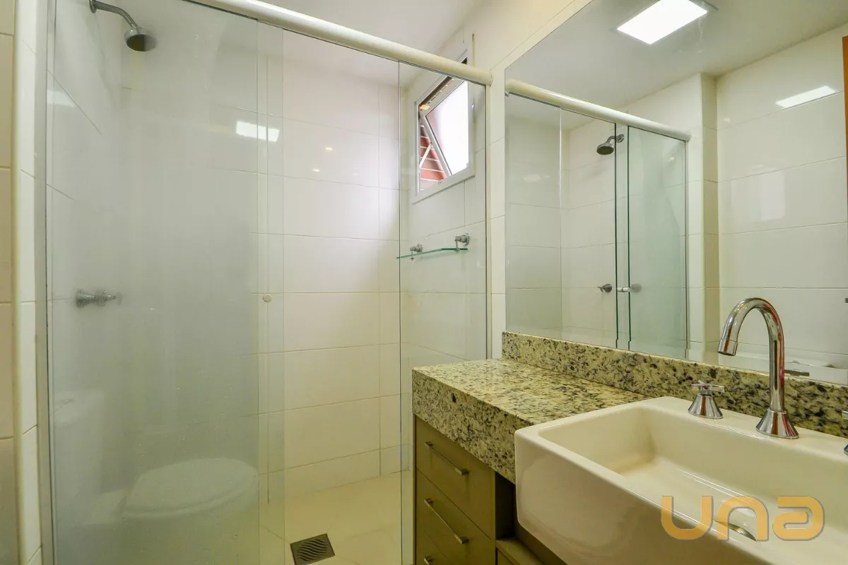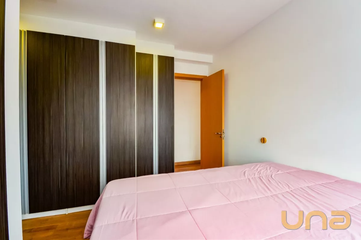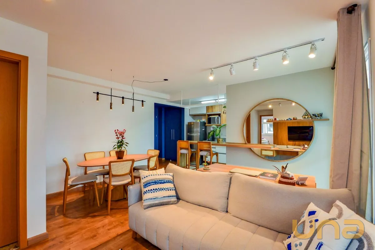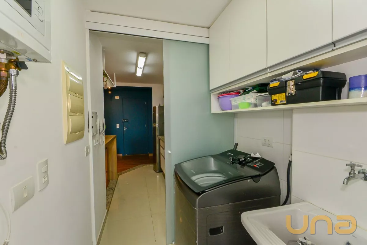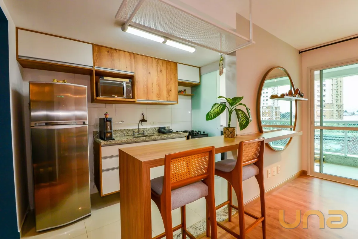 Apartamento semi-mobiliado com armários planejados nos quartos, cozinha, área serviços e banheiros, luminárias e espelhos na sala, quarto, e banheiros.