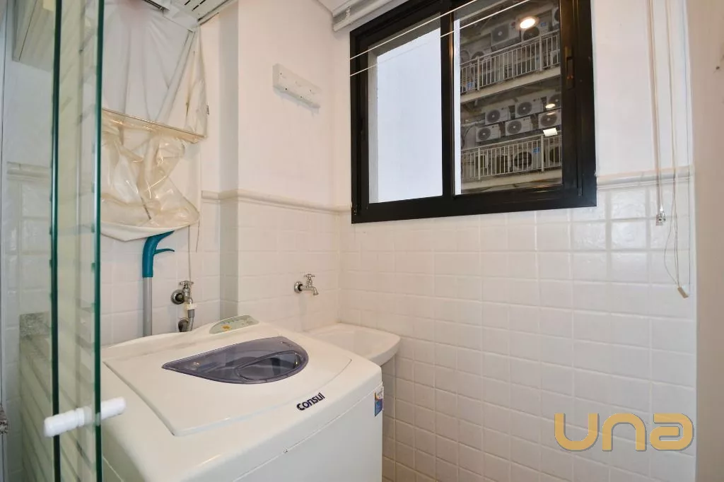 Cozinha moderna e equipada, com móveis planejados, geladeira, fogão, micro-ondas e máquina de lavar;
