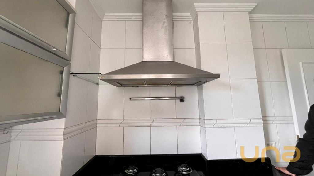 - Cozinha com armários, geladeira, micro-ondas, cooktop, forno elétrico e depurador de ar