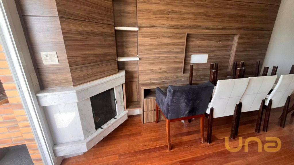 - Sala ampla para dois ambientes, com mesa e 6 cadeiras, mesa de canto com 1 cadeira, painel de TV embutido e lareira.