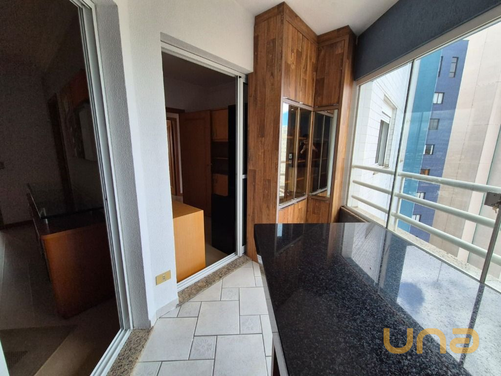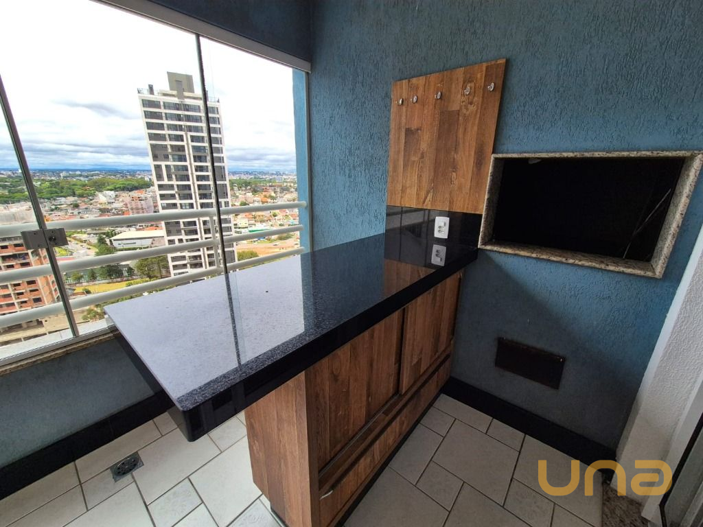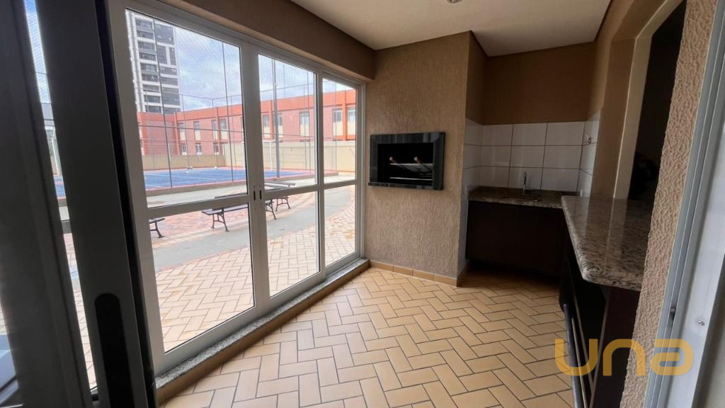 - Sacada com churrasqueira, bancada, armário-bar e fechamento em vidro temperado