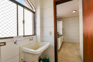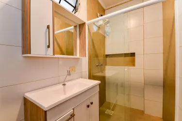 A cozinha possui armários planejados e pia, integrada à área de serviço, formando um ambiente prático, bem ventilado e funcional para a rotina. O banheiro dispõe de armário e box em vidro, atendendo com conforto às necessidades do dia a dia.
