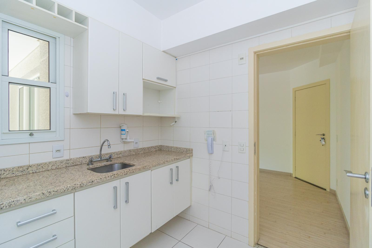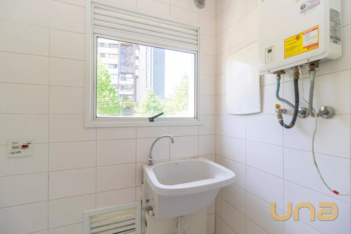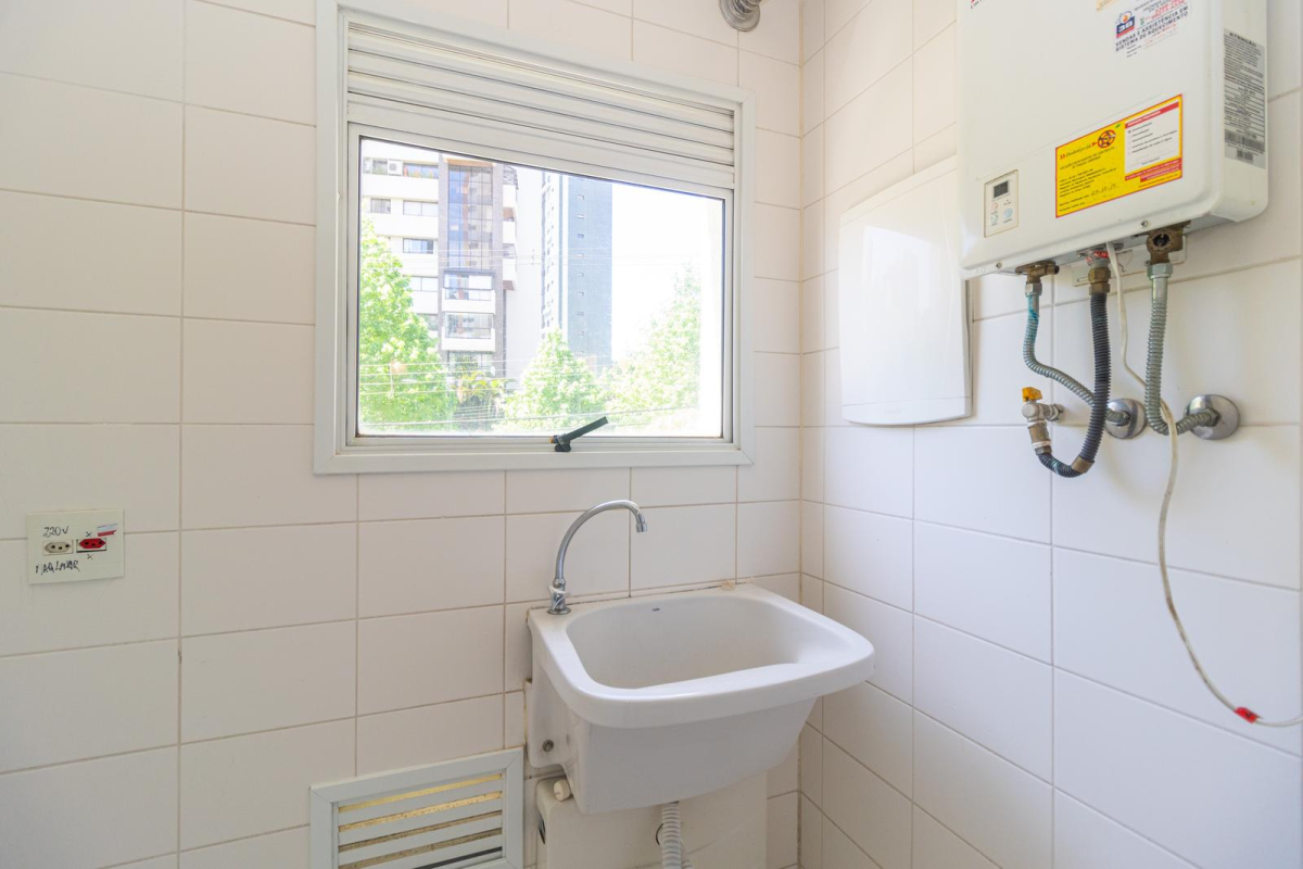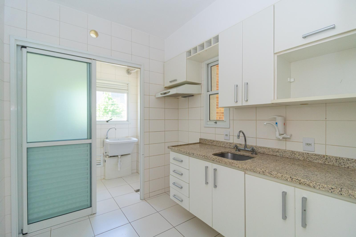 - Cozinha com armários e lavanderia com tanque.