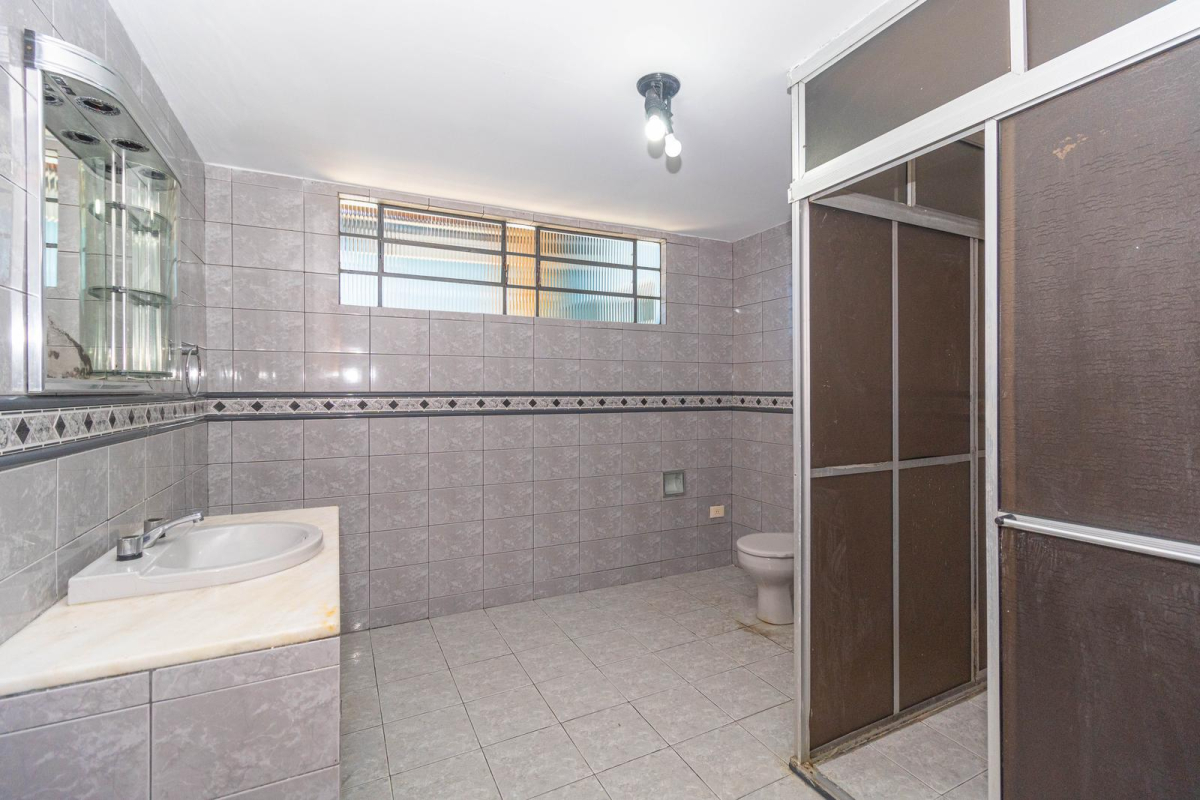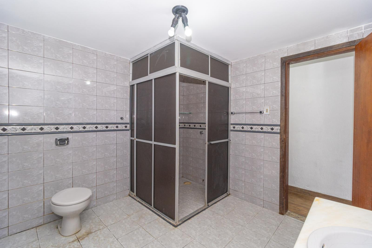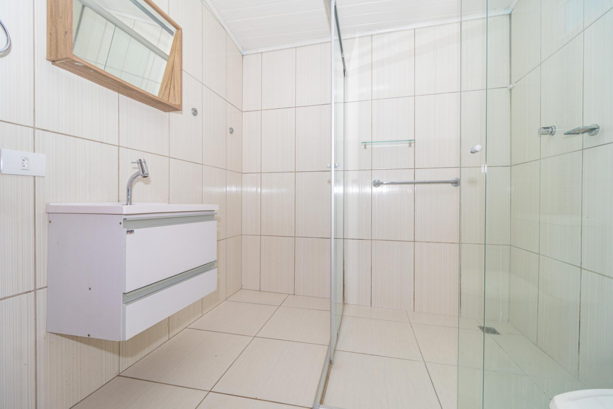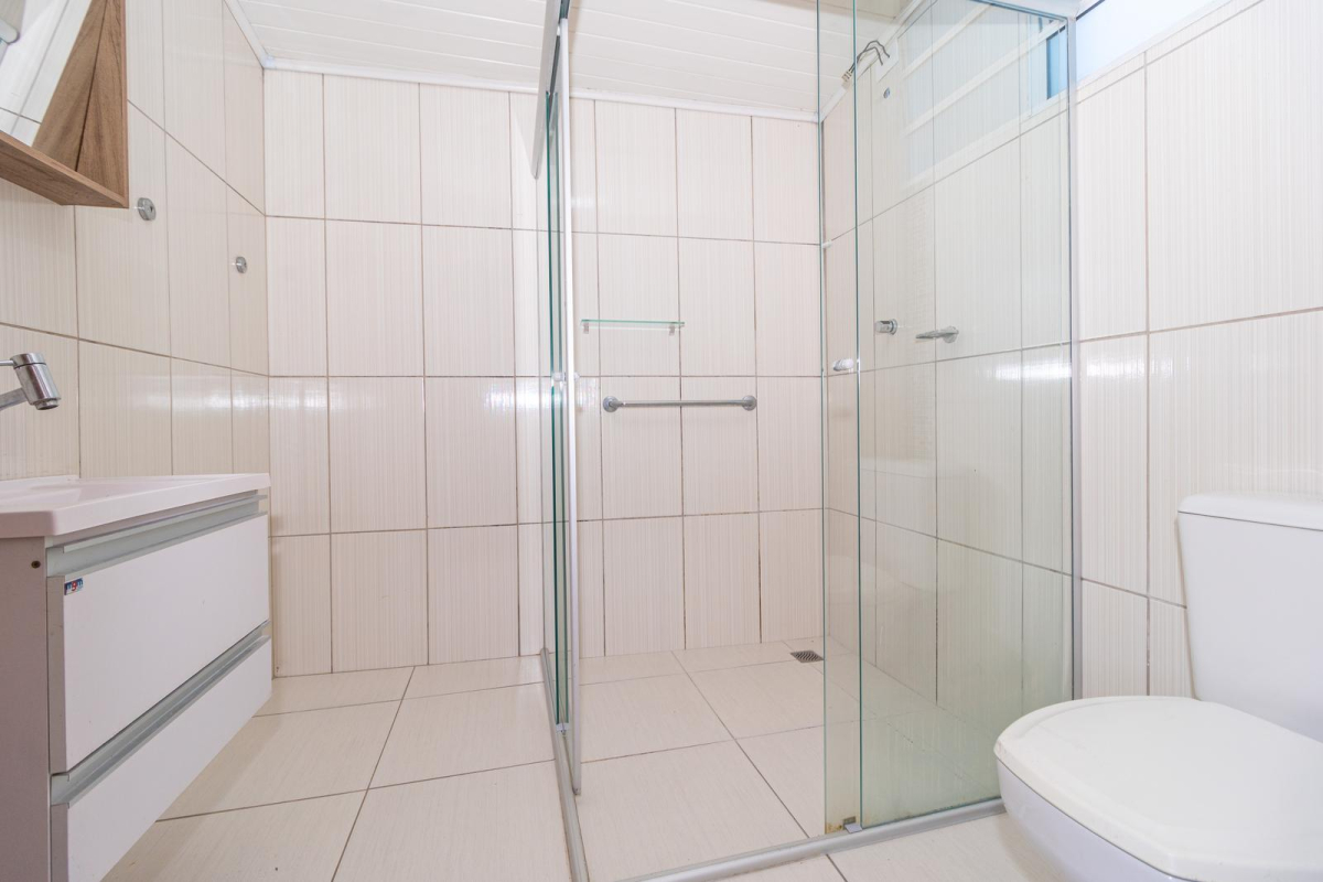 - Banheiro social amplo com box em acrílico, pia e armário com bancada
