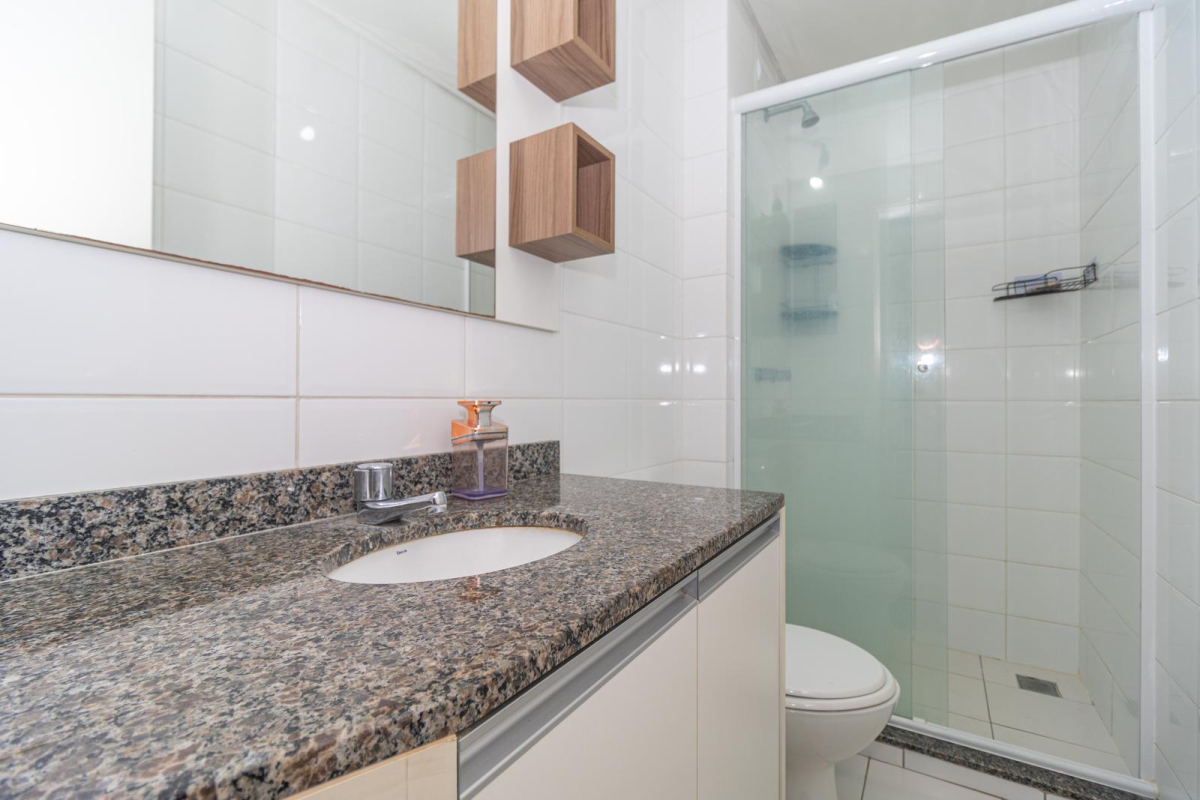 - Banheiro social com armário, espelho e blindex,