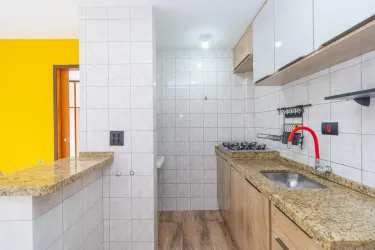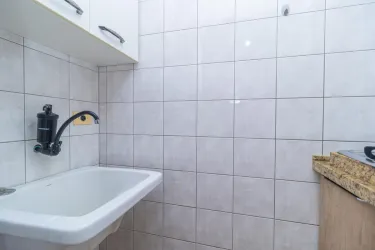 O imóvel conta com cozinha em conceito aberto, equipada com armários planejados e cooktop, além de espaço para lavanderia integrada ao ambiente.