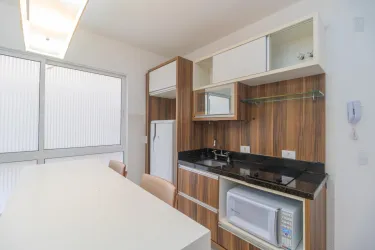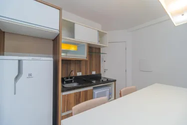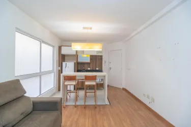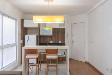 - Sala em um ambiente integrado com a cozinha, possui sofá e mesa alta com banquetas,