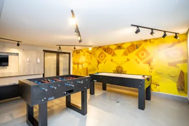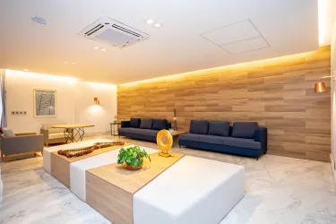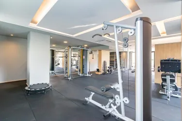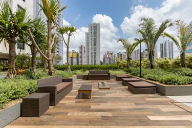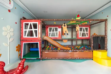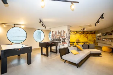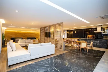 - Sala para 2 ambientes, possui mesa, sofá, ar condicionado e possui acesso para varanda com churrasqueira a carvão e pia,