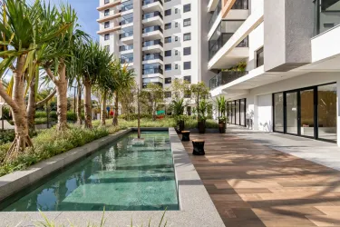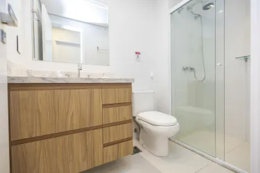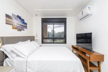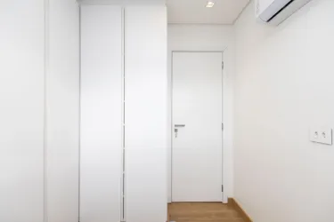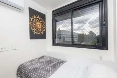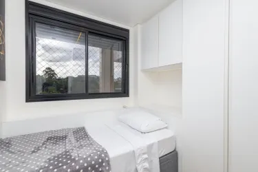 - 2 Quartos sendo uma suíte com armário planejado, cama box queen, cabeceira, mesinhas de cabeceira e ar condicionado, outro com armário planejado, cama box solteiro e ar condicionado,