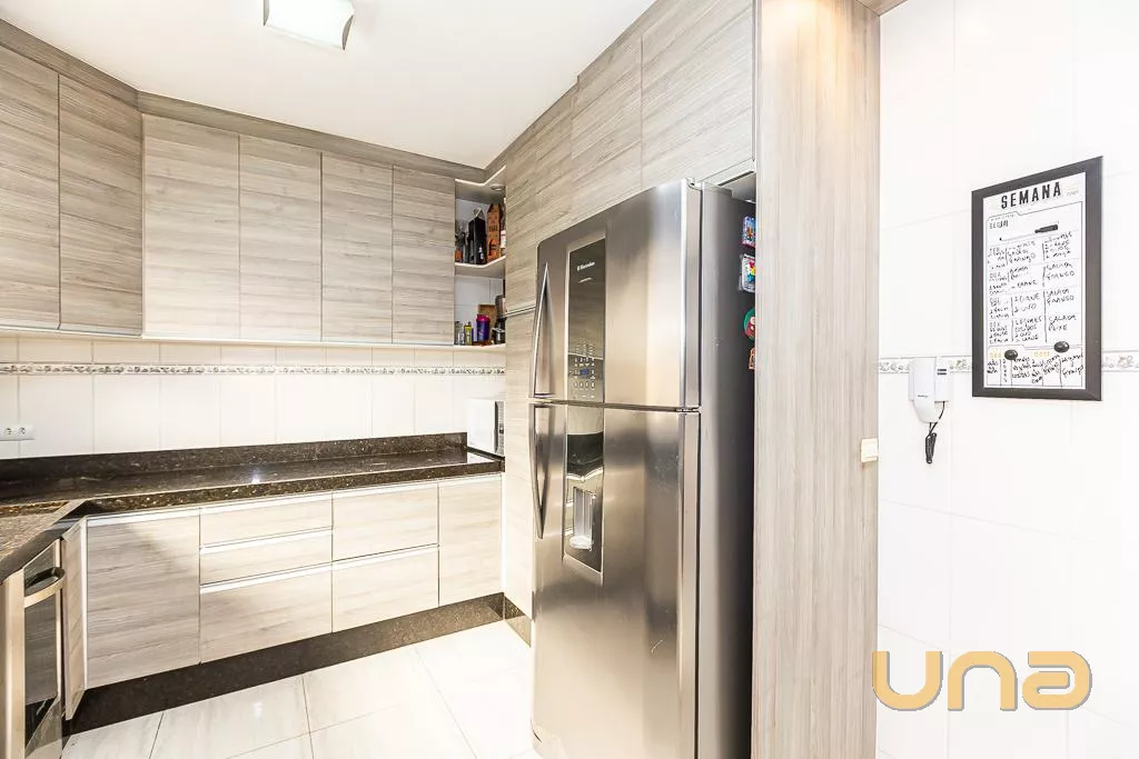 - Cozinha com armários, bancada, máquina de lavar louça, geladeira e fogão com coifa, iluminação em LED atrás da geladeira.