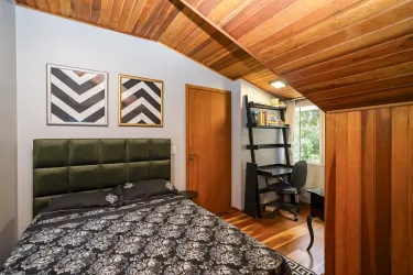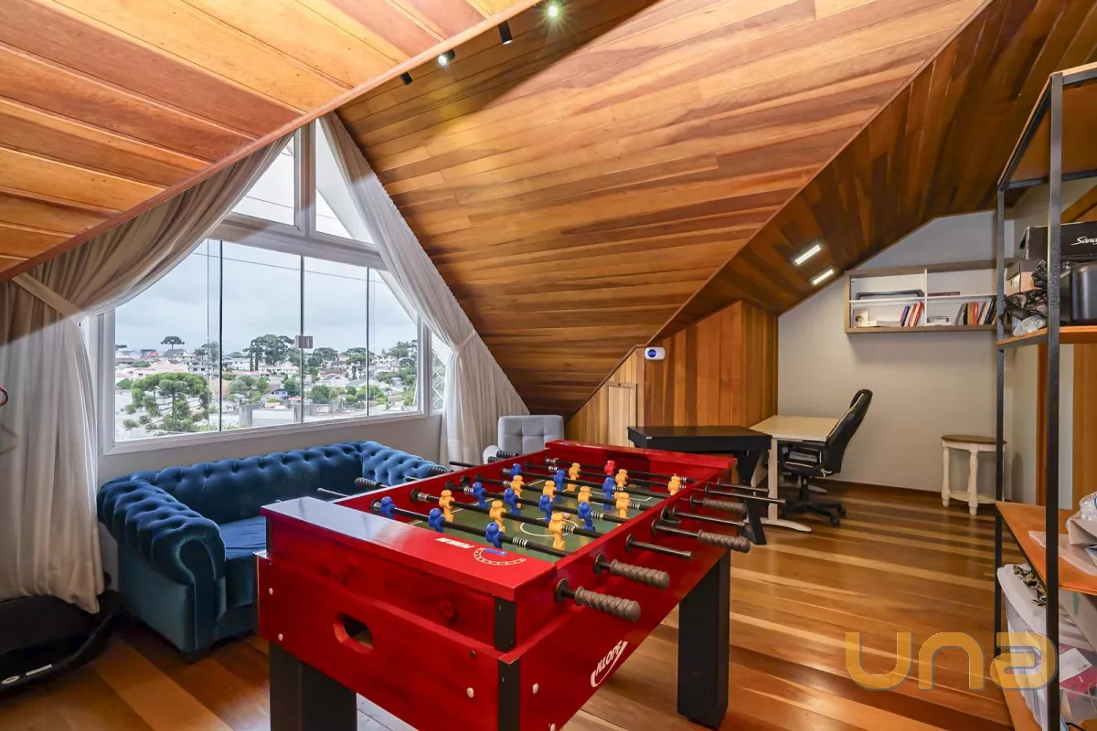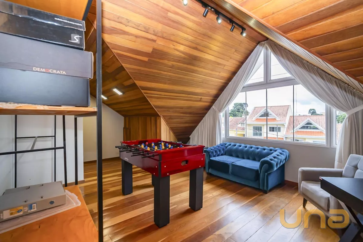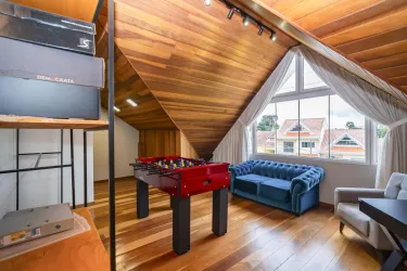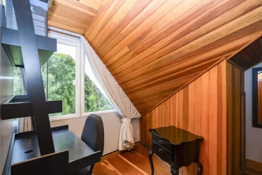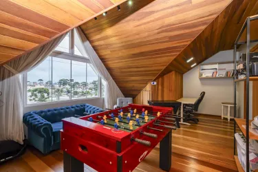 No terceiro piso (ático), 1 ampla suíte. Além de ambiente para uma sala íntima / espaço para jogos, lavabo e escritório.
