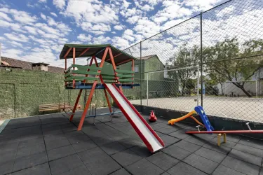 Condomínio com salão de festas, playground, quadra poliesportiva e áreas para descanso.