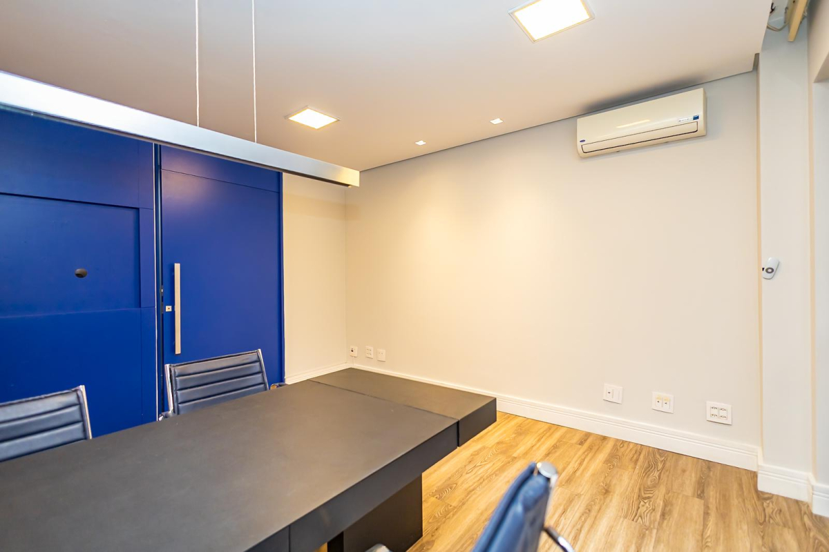 Persianas motorizadas nas salas principal e de reunião, proporcionando conforto e controle de luminosidade.