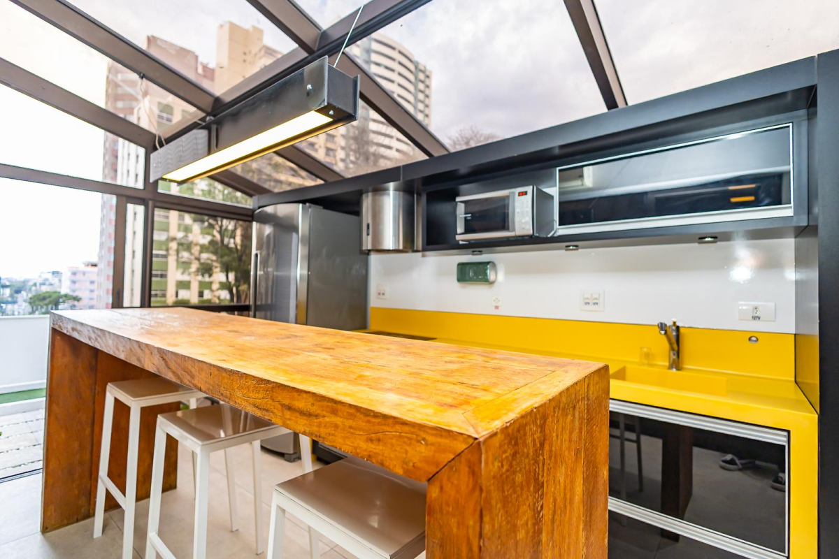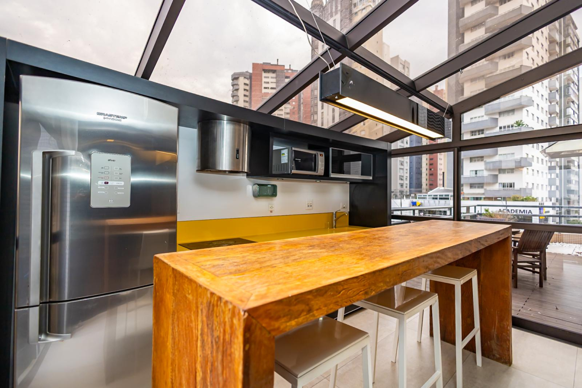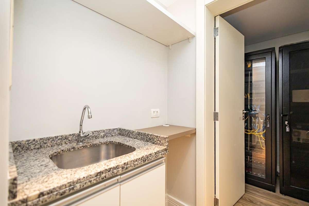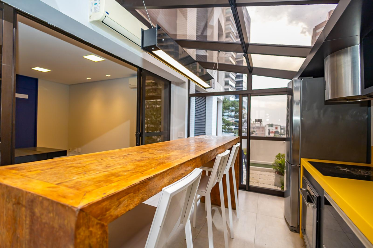 Espaço gourmet exclusivo, integrado à sala principal e ao terraço, equipado com geladeira, fogão, forno elétrico, coifa e micro-ondas — perfeito para momentos de integração e descontração da equipe.